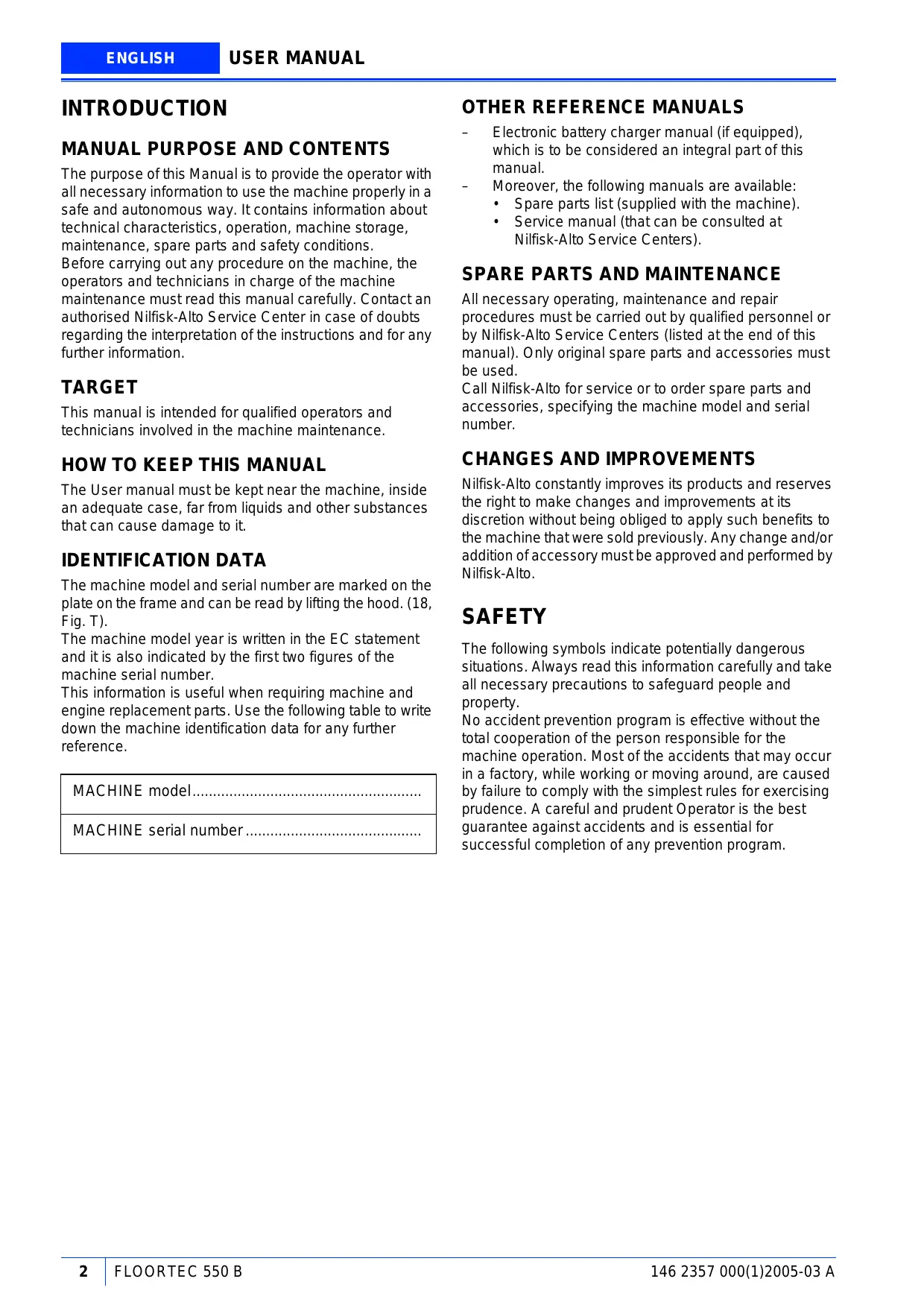 Electronic battery charger manual (if equipped), which is to be considered an integral part of this manual. Moreover, the following manuals are available: • Spare parts list (supplied with the machine). • Service manual (that can be consulted at Nilfisk-Alto Service Centers).