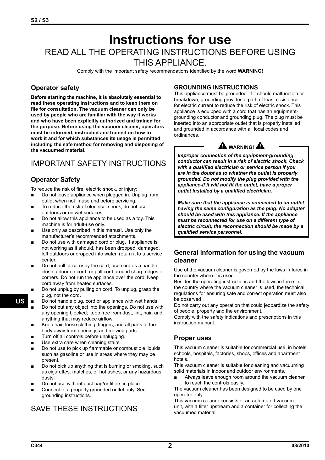 Before starting the machine, it is absolutely essential to read these operating instructions and to keep them on file for consultation. The vacuum cleaner can only be used by people who are familiar with the way it works and who have been explicitly authorized and trained for the purpose. Before using the vacuum cleaner, operators must be informed, instructed and trained on how to work it and for which substances its usage is permitted including the safe method for removing and disposing of the vacuumed material.