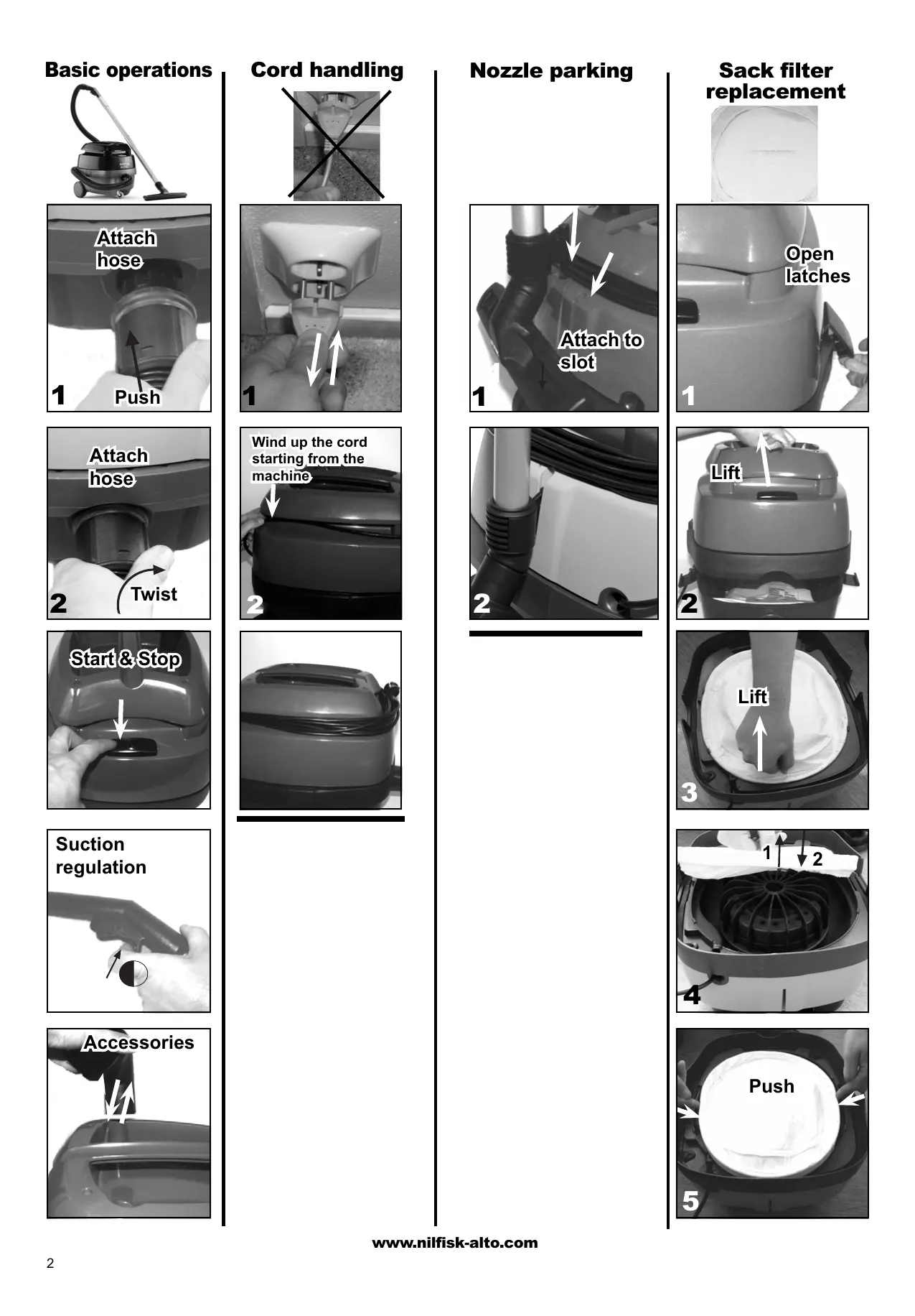 L’aspirateur ne peut pas être utilisé pour aspirer des matières dangereuses, des poussières toxiques ou des matières inflammables ou explosives, de même qu’il ne peut pas être utilisé dans une atmosphère explosible. En aucune circonstance, l’aspirateur ne peut être utilisé pour aspirer des matières chaudes et, en particulier, pour nettoyer des feux ouverts, des cheminées, des fours ou d’autres endroits similaires qui contiennent des cendres chaudes ou incandescentes.L’aspirateur ne peut pas être utilisé pour aspirer de l’eau, des liquides ou des vapeurs inflammables. Ce matériel est destiné à un usage dans des conditions sèches et ne devra être, ni utilisé, ni stocké à l’extérieur. La plage de température de stockage, à l’intérieur, devra se situer entre 60° C maximum et 0° C minimum. L’aspirateur ne peut pas être utilisé si le câble électrique ou la fiche sont endommagés. Contrôlez les régulièrement. En cas de dommage, seuls Nilfisk-Alto ou un distributeur agréé Nilfisk-Alto peuvent procéder à la réparation. Ne manipulez pas le câble électrique ou la fiche avec des mains mouillées. Si le cordon d’alimentation est endommagé, il doit être remplacé par un cordon ou un assemblage spécial disponible auprès du fabricant ou de son agent d’entretien. Ne débranchez pas l’appareil en tirant sur le câble électrique mais en retirant la fiche elle-même. La fiche doit toujours être retirée de la prise murale avant de procéder à toute réparation à la machine ou au câble d’alimentation. Aucune modification d’ordre mécanique, électrique ou thermique ne peut être apportée. Cet aspirateur est muni d’un rupteur thermique pour protéger les composants contre la surchauffe. Si ce rupteur thermique arrête l’aspirateur, attendre de 5 à 10 minutes et l’aspirateur se remet automatiquement en marche. Pendant ce temps vérifier le flexible, le sac et le filtre. Déboucher éventuellement le flexible, remplacer le sac s’il est plein ou remplacer le filtre s’il est colmaté.