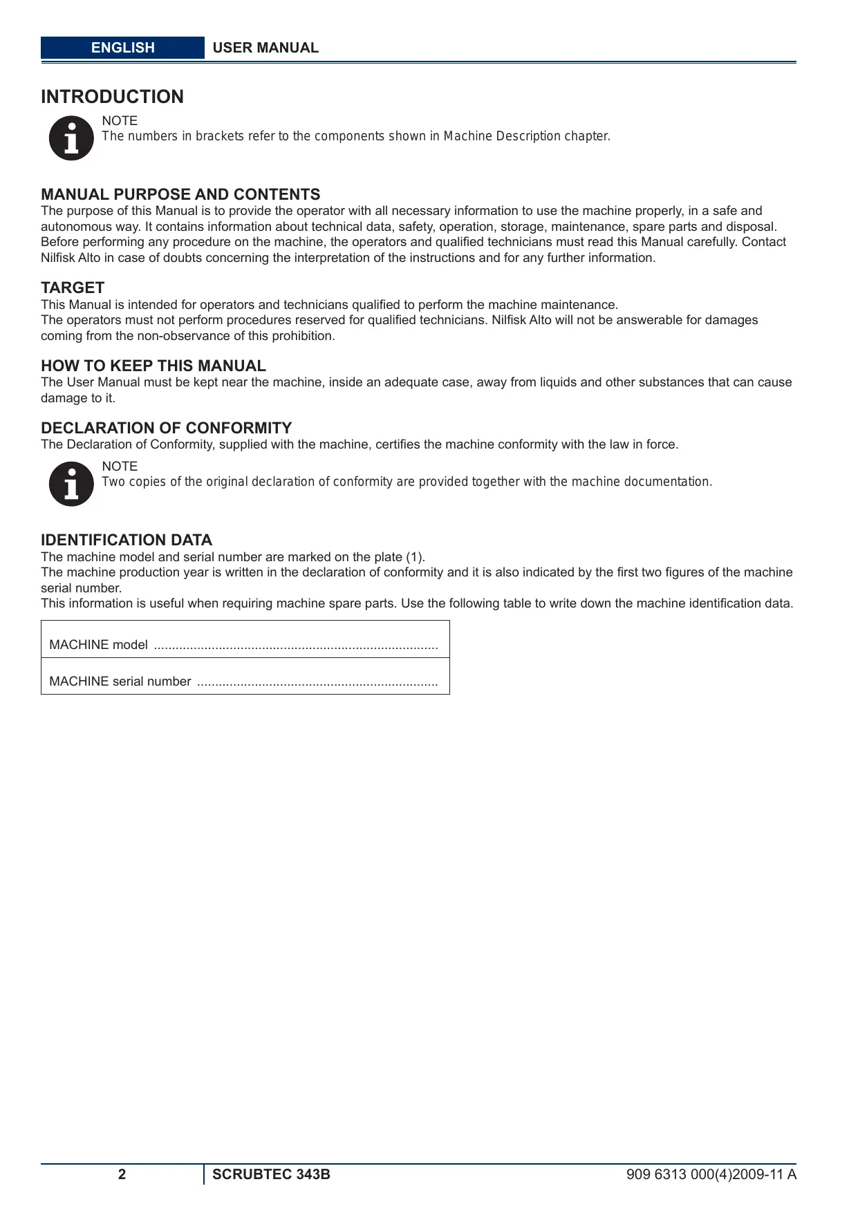 The purpose of this Manual is to provide the operator with all necessary information to use the machine properly, in a safe and autonomous way. It contains information about technical data, safety, operation, storage, maintenance, spare parts and disposal. Before performing any procedure on the machine, the operators and qualified technicians must read this Manual carefully. Contact Nilfisk Alto in case of doubts concerning the interpretation of the instructions and for any further information. TARGET This Manual is intended for operators and technicians qualified to perform the machine maintenance. The operators must not perform procedures reserved for qualified technicians. Nilfisk Alto will not be answerable for damages coming from the non-observance of this prohibition.