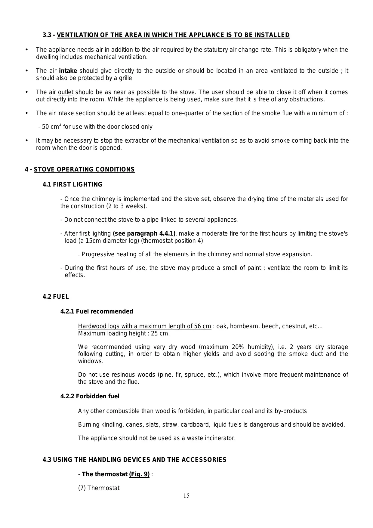 - Once the chimney is implemented and the stove set, observe the drying time of the materials used for the construction (2 to 3 weeks). - Do not connect the stove to a pipe linked to several appliances. - After first lighting (see paragraph 4.4.1), make a moderate fire for the first hours by limiting the stove's load (a 15cm diameter log) (thermostat position 4). . Progressive heating of all the elements in the chimney and normal stove expansion. - During the first hours of use, the stove may produce a smell of paint : ventilate the room to limit its effects.