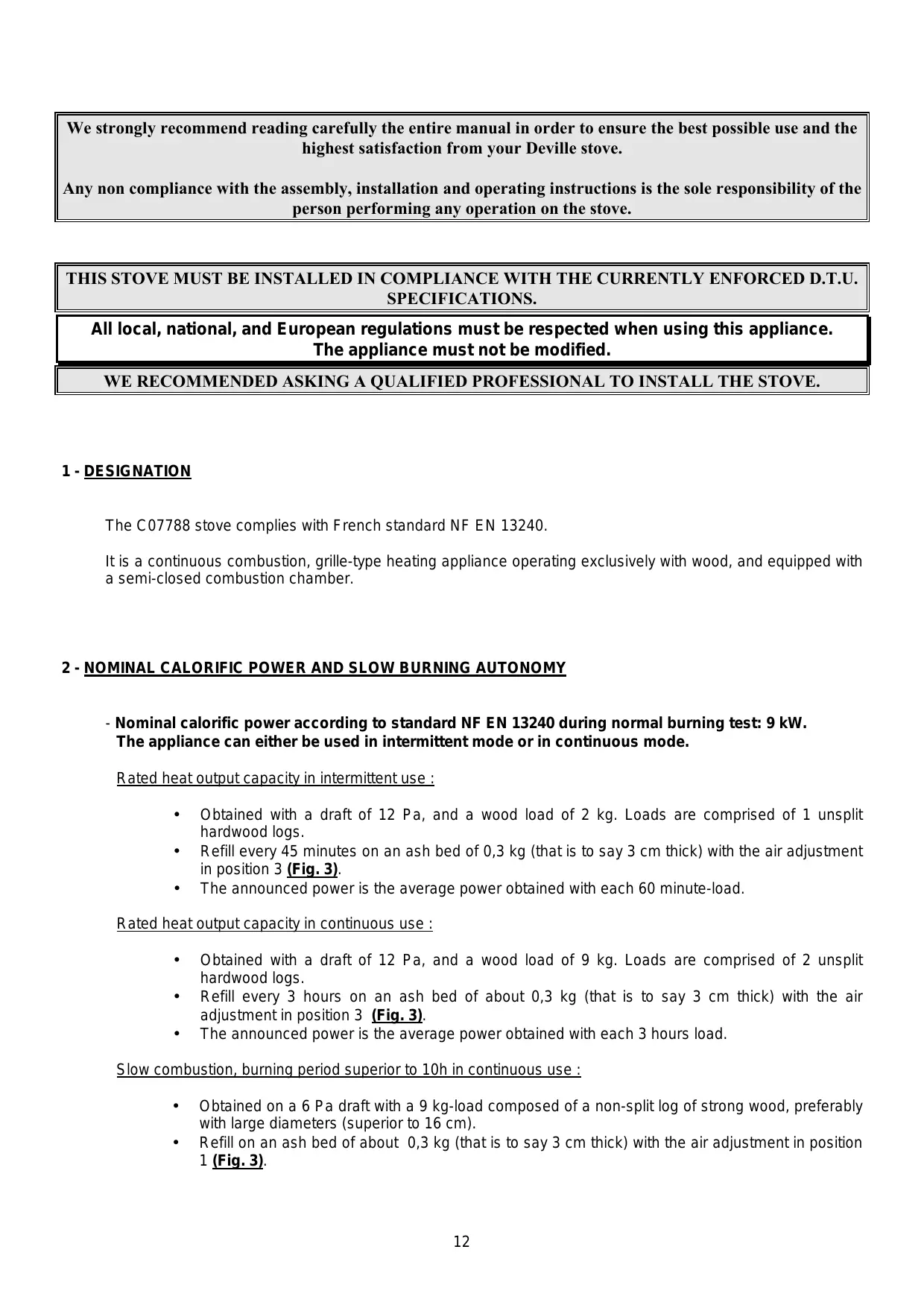 We strongly recommend reading carefully the entire manual in order to ensure the best possible use and the highest satisfaction from your Deville stove. Any non compliance with the assembly, installation and operating instructions is the sole responsibility of the person performing any operation on the stove. THIS STOVE MUST BE INSTALLED IN COMPLIANCE WITH THE CURRENTLY ENFORCED D.T.U. SPECIFICATIONS. All local, national, and European regulations must be respected when using this appliance. The appliance must not be modified. WE RECOMMENDED ASKING A QUALIFIED PROFESSIONAL TO INSTALL THE STOVE.
