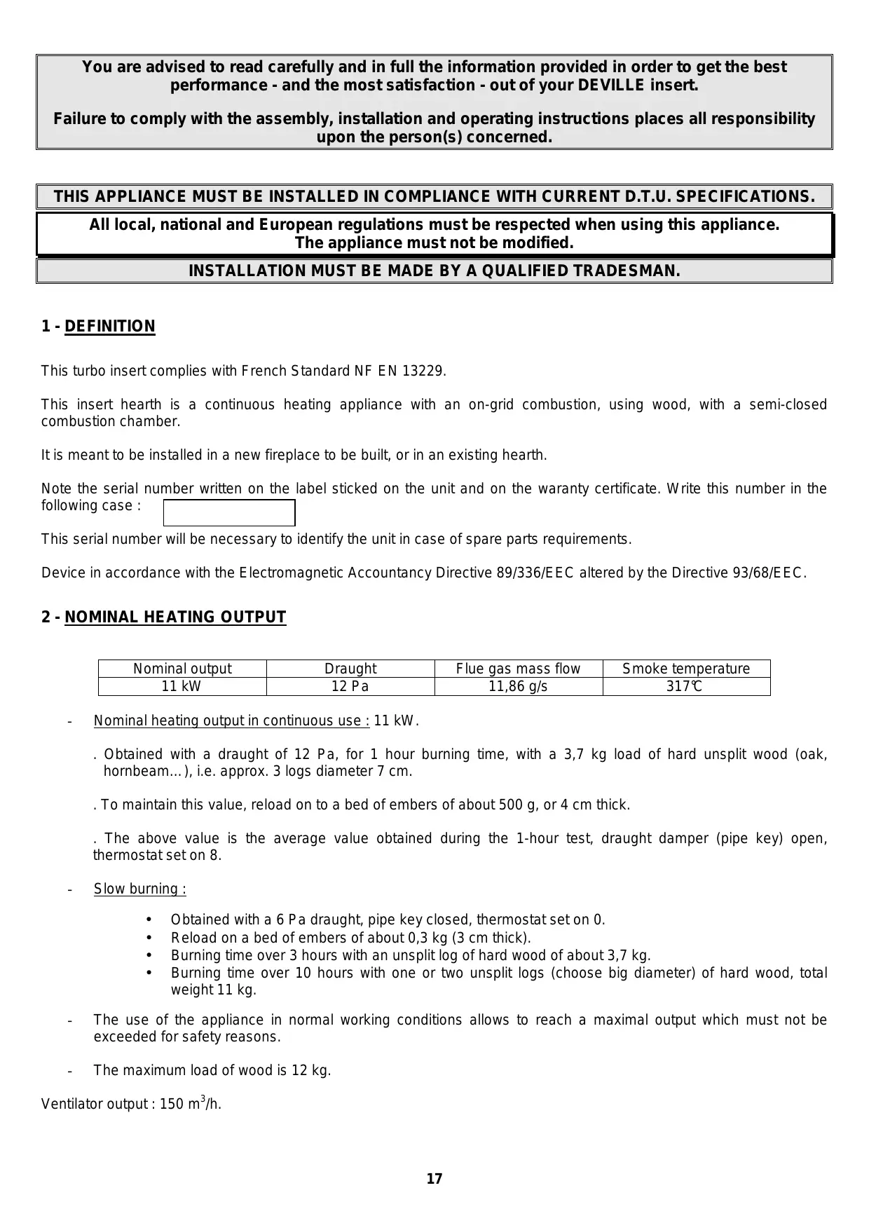 You are advised to read carefully and in full the information provided in order to get the best performance - and the most satisfaction - out of your DEVILLE insert. Failure to comply with the assembly, installation and operating instructions places all responsibility upon the person(s) concerned. THIS APPLIANCE MUST BE INSTALLED IN COMPLIANCE WITH CURRENT D.T.U. SPECIFICATIONS. All local, national and European regulations must be respected when using this appliance. The appliance must not be modified. INSTALLATION MUST BE MADE BY A QUALIFIED TRADESMAN.