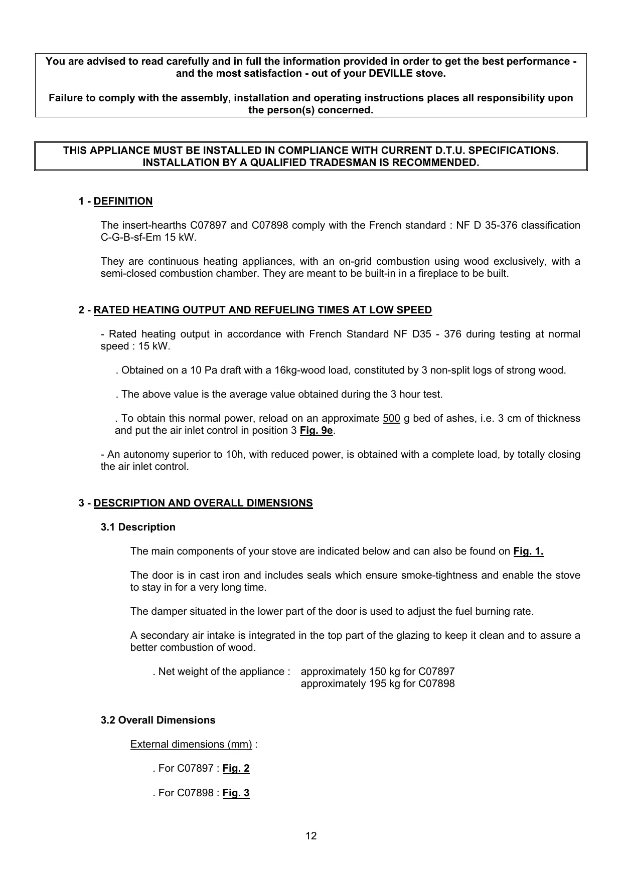 You are advised to read carefully and in full the information provided in order to get the best performance and the most satisfaction - out of your DEVILLE stove. Failure to comply with the assembly, installation and operating instructions places all responsibility upon the person(s) concerned. THIS APPLIANCE MUST BE INSTALLED IN COMPLIANCE WITH CURRENT D.T.U. SPECIFICATIONS. INSTALLATION BY A QUALIFIED TRADESMAN IS RECOMMENDED.