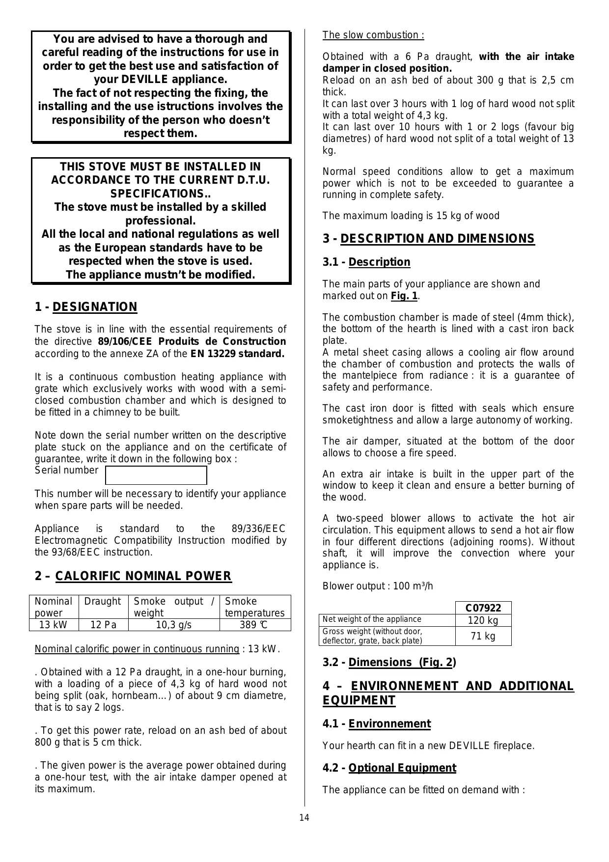 THIS STOVE MUST BE INSTALLED IN ACCORDANCE TO THE CURRENT D.T.U.