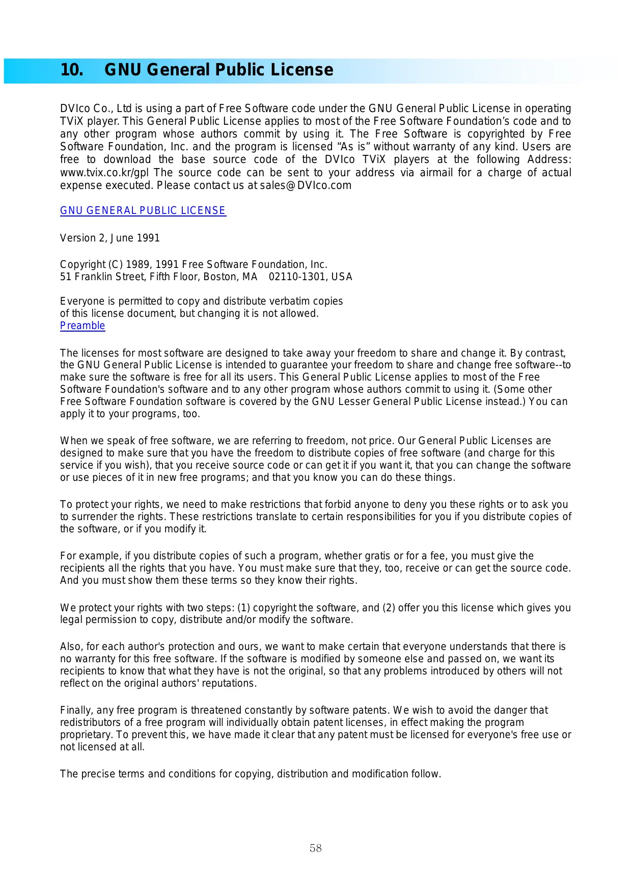 GNU General Public License DVIco Co., Ltd is using a part of Free Software code under the GNU General Public License in operating TViX player. This General Public License applies to most of the Free Software Foundation’s code and to any other program whose authors commit by using it. The Free Software is copyrighted by Free Software Foundation, Inc. and the program is licensed “As is” without warranty of any kind. Users are free to download the base source code of the DVIco TViX players at the following Address: www.tvix.co.kr/gpl The source code can be sent to your address via airmail for a charge of actual expense executed. Please contact us at sales@DVIco.com