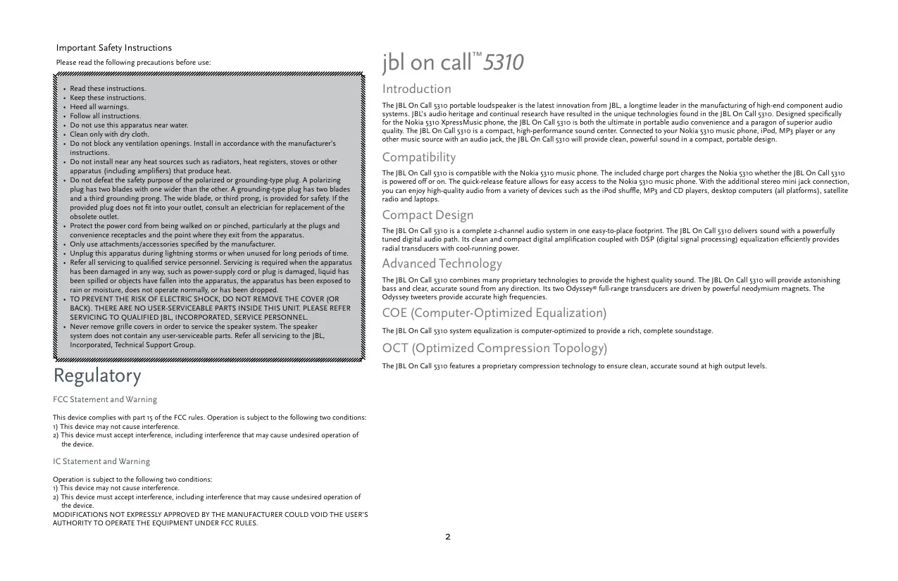 Read these instructions. Keep these instructions. Heed all warnings. Follow all instructions. Do not use this apparatus near water. Clean only with dry cloth. Do not block any ventilation openings. Install in accordance with the manufacturer’s instructions. Do not install near any heat sources such as radiators, heat registers, stoves or other apparatus (including amplifiers) that produce heat. Do not defeat the safety purpose of the polarized or grounding-type plug. A polarizing plug has two blades with one wider than the other. A grounding-type plug has two blades and a third grounding prong. The wide blade, or third prong, is provided for safety. If the provided plug does not fit into your outlet, consult an electrician for replacement of the obsolete outlet. Protect the power cord from being walked on or pinched, particularly at the plugs and convenience receptacles and the point where they exit from the apparatus. Only use attachments/accessories specified by the manufacturer. Unplug this apparatus during lightning storms or when unused for long periods of time. Refer all servicing to qualified service personnel. Servicing is required when the apparatus has been damaged in any way, such as power-supply cord or plug is damaged, liquid has been spilled or objects have fallen into the apparatus, the apparatus has been exposed to rain or moisture, does not operate normally, or has been dropped. TO PREVENT THE RISK OF ELECTRIC SHOCK, DO NOT REMOVE THE COVER (OR BACK). THERE ARE NO USER-SERVICEABLE PARTS INSIDE THIS UNIT. PLEASE REFER SERVICING TO QUALIFIED JBL, INCORPORATED, SERVICE PERSONNEL. Never remove grille covers in order to service the speaker system. The speaker system does not contain any user-serviceable parts. Refer all servicing to the JBL, Incorporated, Technical Support Group. Regulatory jbl on call™5310 Introduction The JBL On Call 5310 portable loudspeaker is the latest innovation from JBL, a longtime leader in the manufacturing of high-end component audio systems. JBL’s audio heritage and continual research have resulted in the unique technologies found in the JBL On Call 5310. Designed specifically for the Nokia 5310 XpressMusic phone, the JBL On Call 5310 is both the ultimate in portable audio convenience and a paragon of superior audio quality. The JBL On Call 5310 is a compact, high-performance sound center. Connected to your Nokia 5310 music phone, iPod, MP3 player or any other music source with an audio jack, the JBL On Call 5310 will provide clean, powerful sound in a compact, portable design. Compatibility The JBL On Call 5310 is compatible with the Nokia 5310 music phone. The included charge port charges the Nokia 5310 whether the JBL On Call 5310 is powered off or on. The quick-release feature allows for easy access to the Nokia 5310 music phone. With the additional stereo mini jack connection, you can enjoy high-quality audio from a variety of devices such as the iPod shuffle, MP3 and CD players, desktop computers (all platforms), satellite radio and laptops. Compact Design The JBL On Call 5310 is a complete 2-channel audio system in one easy-to-place footprint. The JBL On Call 5310 delivers sound with a powerfully tuned digital audio path. Its clean and compact digital amplification coupled with DSP (digital signal processing) equalization efficiently provides radial transducers with cool-running power. Advanced Technology The JBL On Call 5310 combines many proprietary technologies to provide the highest quality sound. The JBL On Call 5310 will provide astonishing bass and clear, accurate sound from any direction. Its two Odyssey® full-range transducers are driven by powerful neodymium magnets. The Odyssey tweeters provide accurate high frequencies. COE (Computer-Optimized Equalization) The JBL On Call 5310 system equalization is computer-optimized to provide a rich, complete soundstage. OCT (Optimized Compression Topology) The JBL On Call 5310 features a proprietary compression technology to ensure clean, accurate sound at high output levels. FCC Statement and Warning This device complies with part 15 of the FCC rules. Operation is subject to the following two conditions: