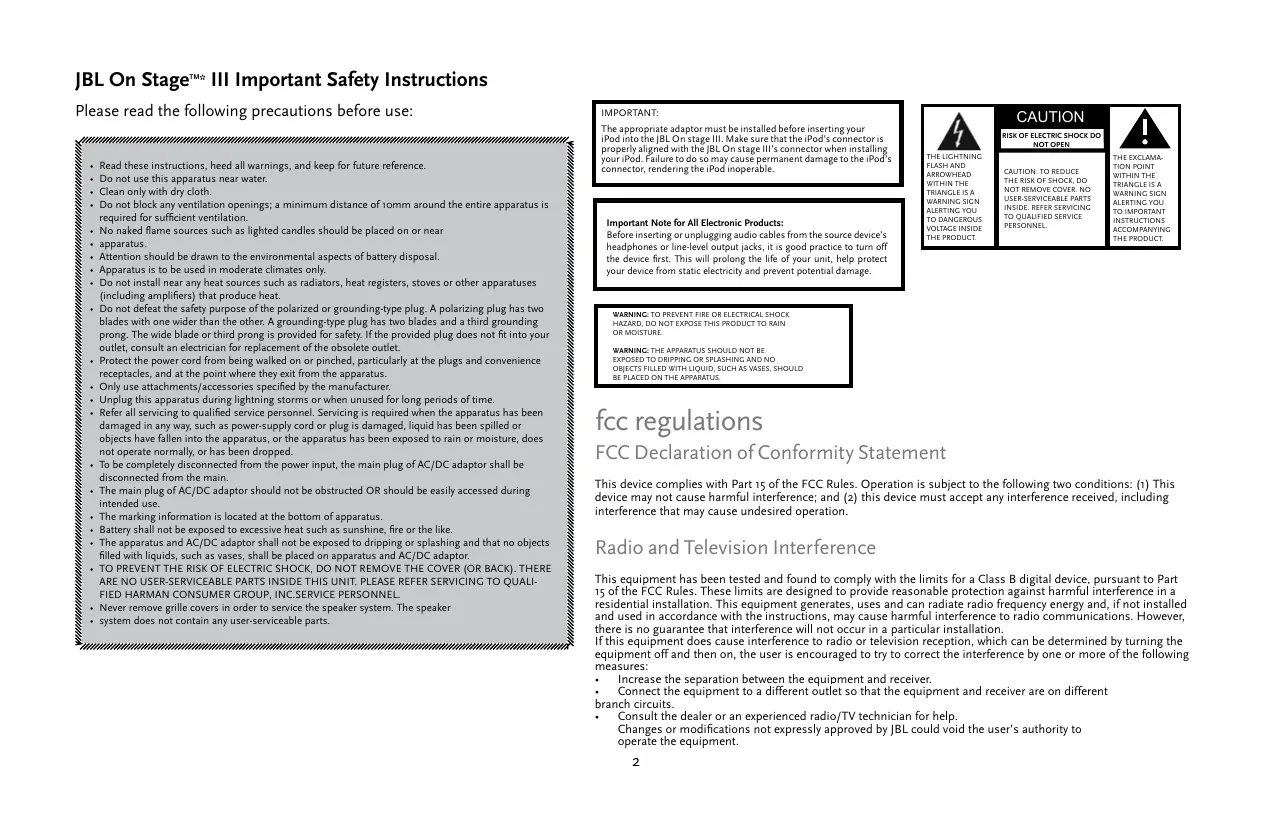 Do not use this apparatus near water. Clean only with dry cloth. Do not block any ventilation openings; a minimum distance of 10mm around the entire apparatus is required for sufficient ventilation. No naked flame sources such as lighted candles should be placed on or near apparatus. Attention should be drawn to the environmental aspects of battery disposal. Apparatus is to be used in moderate climates only. Do not install near any heat sources such as radiators, heat registers, stoves or other apparatuses (including amplifiers) that produce heat. Do not defeat the safety purpose of the polarized or grounding-type plug. A polarizing plug has two blades with one wider than the other. A grounding-type plug has two blades and a third grounding prong. The wide blade or third prong is provided for safety. If the provided plug does not fit into your outlet, consult an electrician for replacement of the obsolete outlet. Protect the power cord from being walked on or pinched, particularly at the plugs and convenience receptacles, and at the point where they exit from the apparatus. Only use attachments/accessories specified by the manufacturer. Unplug this apparatus during lightning storms or when unused for long periods of time. Refer all servicing to qualified service personnel. Servicing is required when the apparatus has been damaged in any way, such as power-supply cord or plug is damaged, liquid has been spilled or objects have fallen into the apparatus, or the apparatus has been exposed to rain or moisture, does not operate normally, or has been dropped. To be completely disconnected from the power input, the main plug of AC/DC adaptor shall be disconnected from the main. The main plug of AC/DC adaptor should not be obstructed OR should be easily accessed during intended use. The marking information is located at the bottom of apparatus. Battery shall not be exposed to excessive heat such as sunshine, fire or the like. The apparatus and AC/DC adaptor shall not be exposed to dripping or splashing and that no objects filled with liquids, such as vases, shall be placed on apparatus and AC/DC adaptor. TO PREVENT THE RISK OF ELECTRIC SHOCK, DO NOT REMOVE THE COVER (OR BACK). THERE ARE NO USER-SERVICEABLE PARTS INSIDE THIS UNIT. PLEASE REFER SERVICING TO QUALIFIED HARMAN CONSUMER GROUP, INC.SERVICE PERSONNEL. Never remove grille covers in order to service the speaker system. The speaker system does not contain any user-serviceable parts.