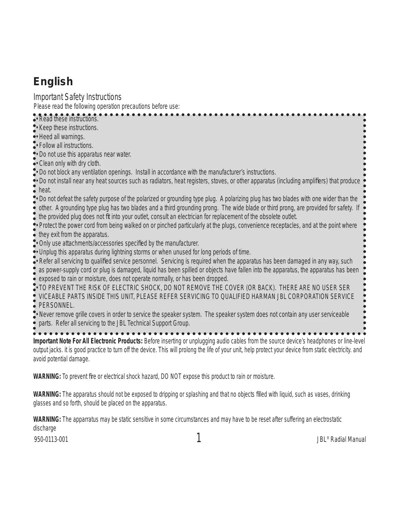 Important Safety Instructions Please read the following operation precautions before use: • Read these instructions. • Keep these instructions. • Heed all warnings. • Follow all instructions. • Do not use this apparatus near water. • Clean only with dry cloth. • Do not block any ventilation openings. Install in accordance with the manufacturer’s instructions. • Do not install near any heat sources such as radiators, heat registers, stoves, or other apparatus (including amplifiers) that produce heat. • Do not defeat the safety purpose of the polarized or grounding type plug. A polarizing plug has two blades with one wider than the other. A grounding type plug has two blades and a third grounding prong. The wide blade or third prong, are provided for safety. If the provided plug does not fit into your outlet, consult an electrician for replacement of the obsolete outlet. • Protect the power cord from being walked on or pinched particularly at the plugs, convenience receptacles, and at the point where they exit from the apparatus. • Only use attachments/accessories specified by the manufacturer. • Unplug this apparatus during lightning storms or when unused for long periods of time. • Refer all servicing to qualified service personnel. Servicing is required when the apparatus has been damaged in any way, such as power-supply cord or plug is damaged, liquid has been spilled or objects have fallen into the apparatus, the apparatus has been exposed to rain or moisture, does not operate normally, or has been dropped. • TO PREVENT THE RISK OF ELECTRIC SHOCK, DO NOT REMOVE THE COVER (OR BACK). THERE ARE NO USER SER VICEABLE PARTS INSIDE THIS UNIT, PLEASE REFER SERVICING TO QUALIFIED HARMAN JBL CORPORATION SERVICE PERSONNEL. • Never remove grille covers in order to service the speaker system. The speaker system does not contain any user serviceable parts. Refer all servicing to the JBL Technical Support Group. Important Note For All Electronic Products: Before inserting or unplugging audio cables from the source device’s headphones or line-level output jacks. it is good practice to turn off the device. This will prolong the life of your unit, help protect your device from static electricity. and avoid potential damage. WARNING: To prevent fire or electrical shock hazard, DO NOT expose this product to rain or moisture. WARNING: The apparatus should not be exposed to dripping or splashing and that no objects filled with liquid, such as vases, drinking glasses and so forth, should be placed on the apparatus. WARNING: The apparratus may be static sensitive in some circumstances and may have to be reset after suffering an electrostatic discharge 950-0113-001