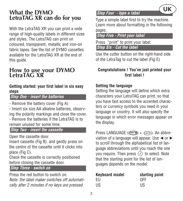 Step Four - type a label Type a simple label first to try the machine. Learn more about formatting in the following pages. Step Five - Print your label With the LetraTAG XR you can print a wide range of high-quality labels in different sizes and styles. The LetraTAG can print on coloured, transparent, metallic and iron-on fabric tapes. See the list of DYMO cassettes available for the LetraTAG XR at the end of this guide. Press “print” to print your label. Step Six - Cut the label Use the cutter button on the right-hand side of the LetraTag to cut the label (Fig E) How to use your DYMO LetraTAG XR Congratulations ! You’ve just printed your first label ! Setting the language Setting the language will define which extra characters your LetraTAG can print, so that you have fast access to the accented characters or currency symbols you need in your language or country. It will also specify the language in which error messages appear on the display. Getting started: your first label in six easy steps Step One - insert the batteries - Remove the battery cover (Fig A) - Insert six size AA alkaline batteries, observing the polarity markings and close the cover. - Remove the batteries if the LetraTAG is to remain unused for some time. Step Two - insert the cassette Press LANGUAGE ( + CAPS ). An abbreviation of a language will appear. Use Q or R to scroll through the alphabetical list of language abbreviations until you reach the one you require. Then press ` to select. Note that the starting point for the list of languages depends on the model: SHIFT Open the cassette door Insert cassette (Fig B). and gently press on the centre of the cassette until it clicks into place (Fig C). Check the cassette is correctly positioned before closing the cassette door. Step Three - switch on Keyboard model