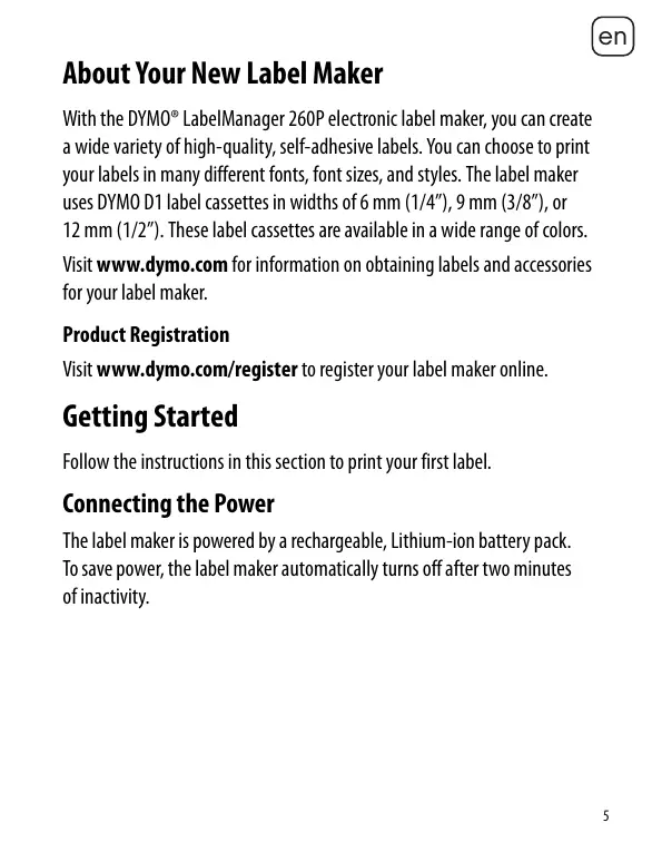 About Your New Label Maker With the DYMO® LabelManager 260P electronic label maker, you can create a wide variety of high-quality, self-adhesive labels. You can choose to print your labels in many different fonts, font sizes, and styles. The label maker uses DYMO D1 label cassettes in widths of 6 mm (1/4”), 9 mm (3/8”), or 12 mm (1/2”). These label cassettes are available in a wide range of colors. Visit www.dymo.com for information on obtaining labels and accessories for your label maker. Product Registration Visit www.dymo.com/register to register your label maker online. Getting Started Follow the instructions in this section to print your first label. Connecting the Power The label maker is powered by a rechargeable, Lithium-ion battery pack. To save power, the label maker automatically turns off after two minutes of inactivity.