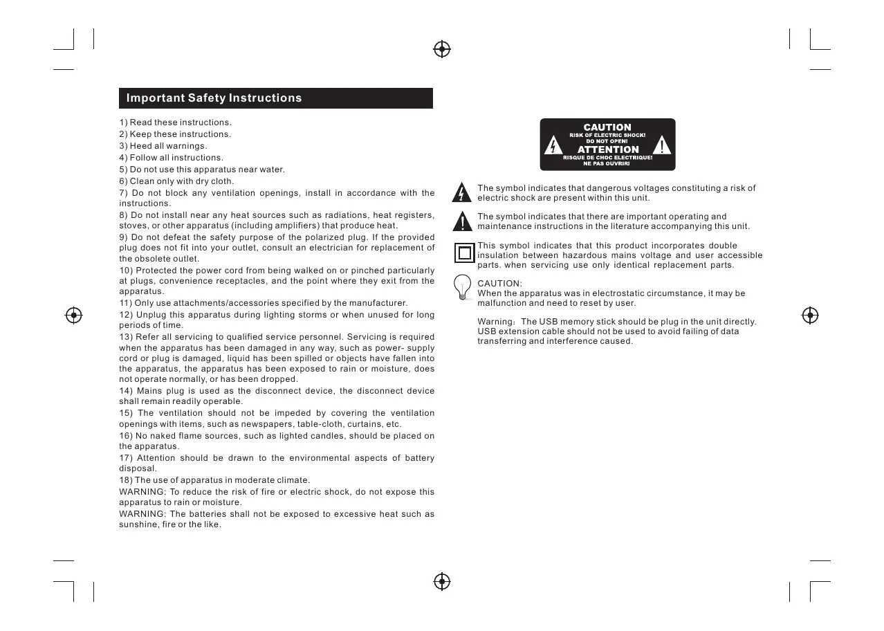 sunshine, fire or the like. The symbol indicates that dangerous voltages constituting a risk of electric shock are present within this unit. The symbol indicates that there are important operating and maintenance instructions in the literature accompanying this unit. This symbol indicates that this product incorporates double insulation between hazardous mains voltage and user accessible parts.when servicing use only identical replacement parts. CAUTION: When the apparatus was in electrostatic circumstance, it may be malfunction and need to reset by user. Warning:The USB memory stick should be plug in the unit directly. USB extension cable should not be used to avoid failing of data transferring and interference caused. Table of Contents Front and Rear Panel