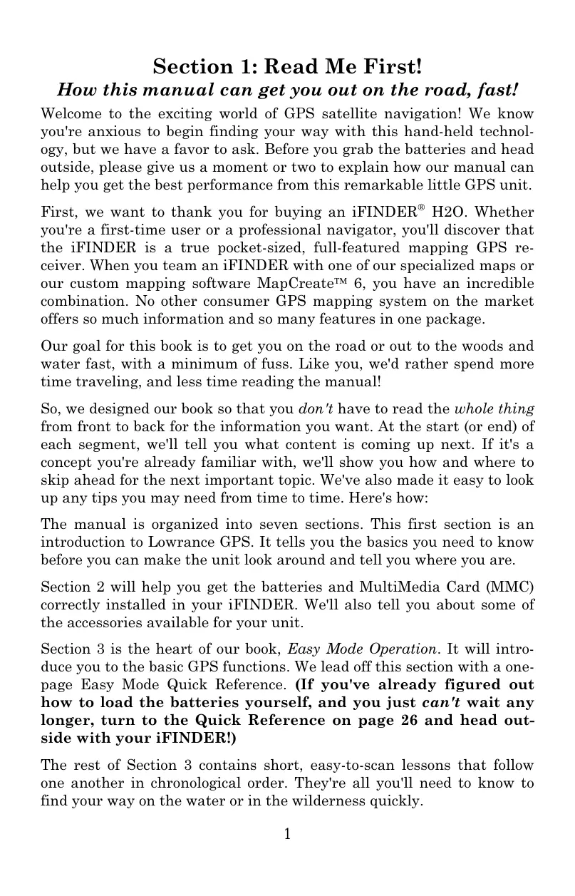 How this manual can get you out on the road, fast! Welcome to the exciting world of GPS satellite navigation! We know you're anxious to begin finding your way with this hand-held technology, but we have a favor to ask. Before you grab the batteries and head outside, please give us a moment or two to explain how our manual can help you get the best performance from this remarkable little GPS unit. First, we want to thank you for buying an iFINDER H2O. Whether you're a first-time user or a professional navigator, you'll discover that the iFINDER is a true pocket-sized, full-featured mapping GPS receiver. When you team an iFINDER with one of our specialized maps or our custom mapping software MapCreate 6, you have an incredible combination. No other consumer GPS mapping system on the market offers so much information and so many features in one package. Our goal for this book is to get you on the road or out to the woods and water fast, with a minimum of fuss. Like you, we'd rather spend more time traveling, and less time reading the manual! So, we designed our book so that you don't have to read the whole thing from front to back for the information you want. At the start (or end) of each segment, we'll tell you what content is coming up next. If it's a concept you're already familiar with, we'll show you how and where to skip ahead for the next important topic. We've also made it easy to look up any tips you may need from time to time. Here's how: The manual is organized into seven sections. This first section is an introduction to Lowrance GPS. It tells you the basics you need to know before you can make the unit look around and tell you where you are.