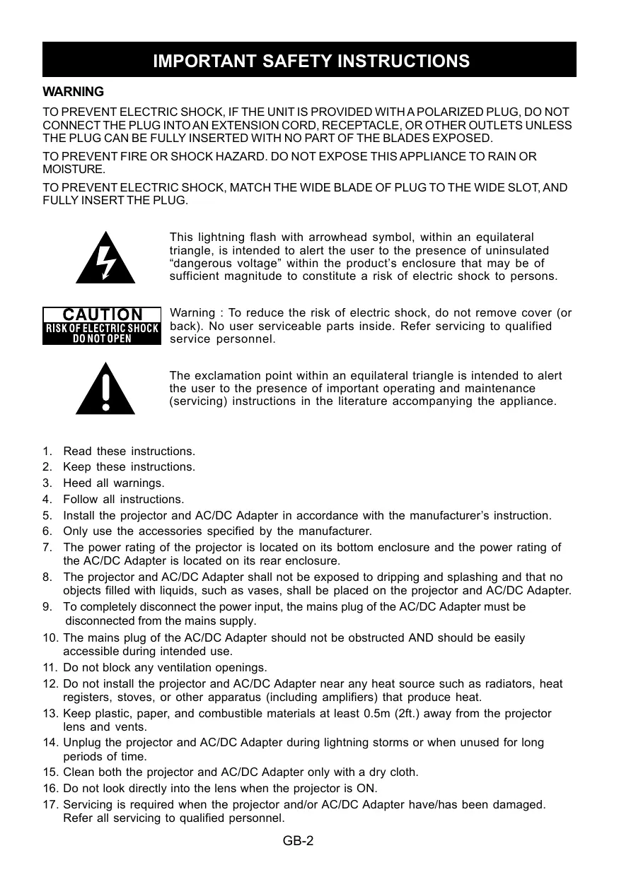 back). No user serviceable parts inside. Refer servicing to qualified service personnel. The exclamation point within an equilateral triangle is intended to alert the user to the presence of important operating and maintenance (servicing) instructions in the literature accompanying the appliance. Read these instructions. Keep these instructions. Heed all warnings. Follow all instructions. Install the projector and AC/DC Adapter in accordance with the manufacturer’s instruction. Only use the accessories specified by the manufacturer. The power rating of the projector is located on its bottom enclosure and the power rating of the AC/DC Adapter is located on its rear enclosure. The projector and AC/DC Adapter shall not be exposed to dripping and splashing and that no objects filled with liquids, such as vases, shall be placed on the projector and AC/DC Adapter. To completely disconnect the power input, the mains plug of the AC/DC Adapter must be disconnected from the mains supply. The mains plug of the AC/DC Adapter should not be obstructed AND should be easily accessible during intended use. Do not block any ventilation openings. Do not install the projector and AC/DC Adapter near any heat source such as radiators, heat registers, stoves, or other apparatus (including amplifiers) that produce heat. Keep plastic, paper, and combustible materials at least 0.5m (2ft.) away from the projector lens and vents. Unplug the projector and AC/DC Adapter during lightning storms or when unused for long periods of time. Clean both the projector and AC/DC Adapter only with a dry cloth. Do not look directly into the lens when the projector is ON. Servicing is required when the projector and/or AC/DC Adapter have/has been damaged. Refer all servicing to qualified personnel. GB-2