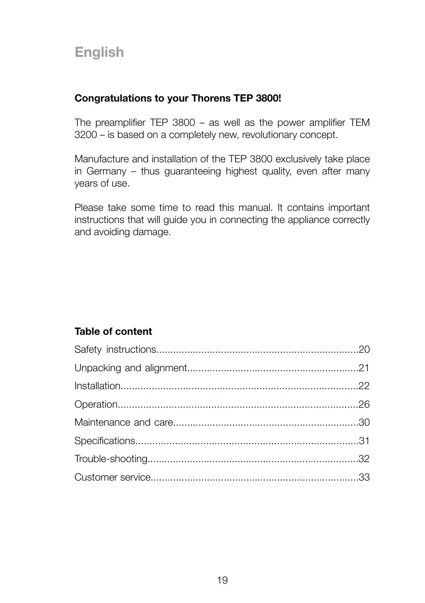 - English Congratulations to your Thorens TEP 3800! The preamplifier TEP 3800 – as well as the power amplifier TEM 3200 – is based on a completely new, revolutionary concept. Manufacture and installation of the TEP 3800 exclusively take place in Germany – thus guaranteeing highest quality, even after many years of use. Please take some time to read this manual. It contains important instructions that will guide you in connecting the appliance correctly and avoiding damage. Table of content Safety instructions p. 20