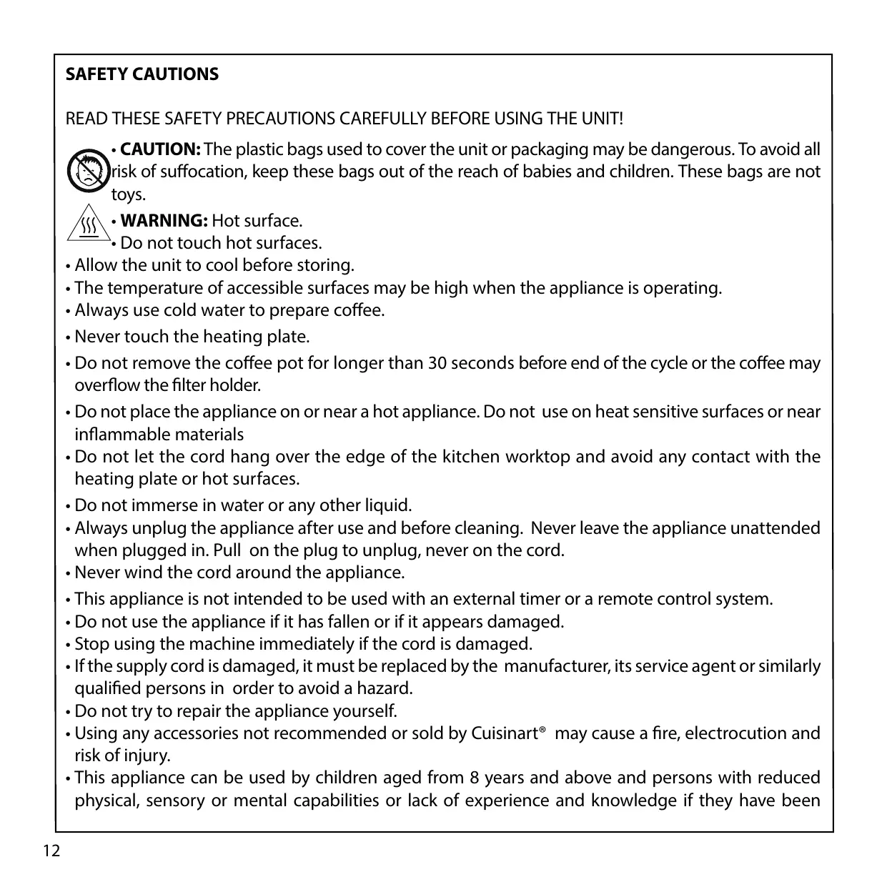 - Using any accessories not recommended or sold by Cuisinart® may cause a fire, electrocution and risk of injury.