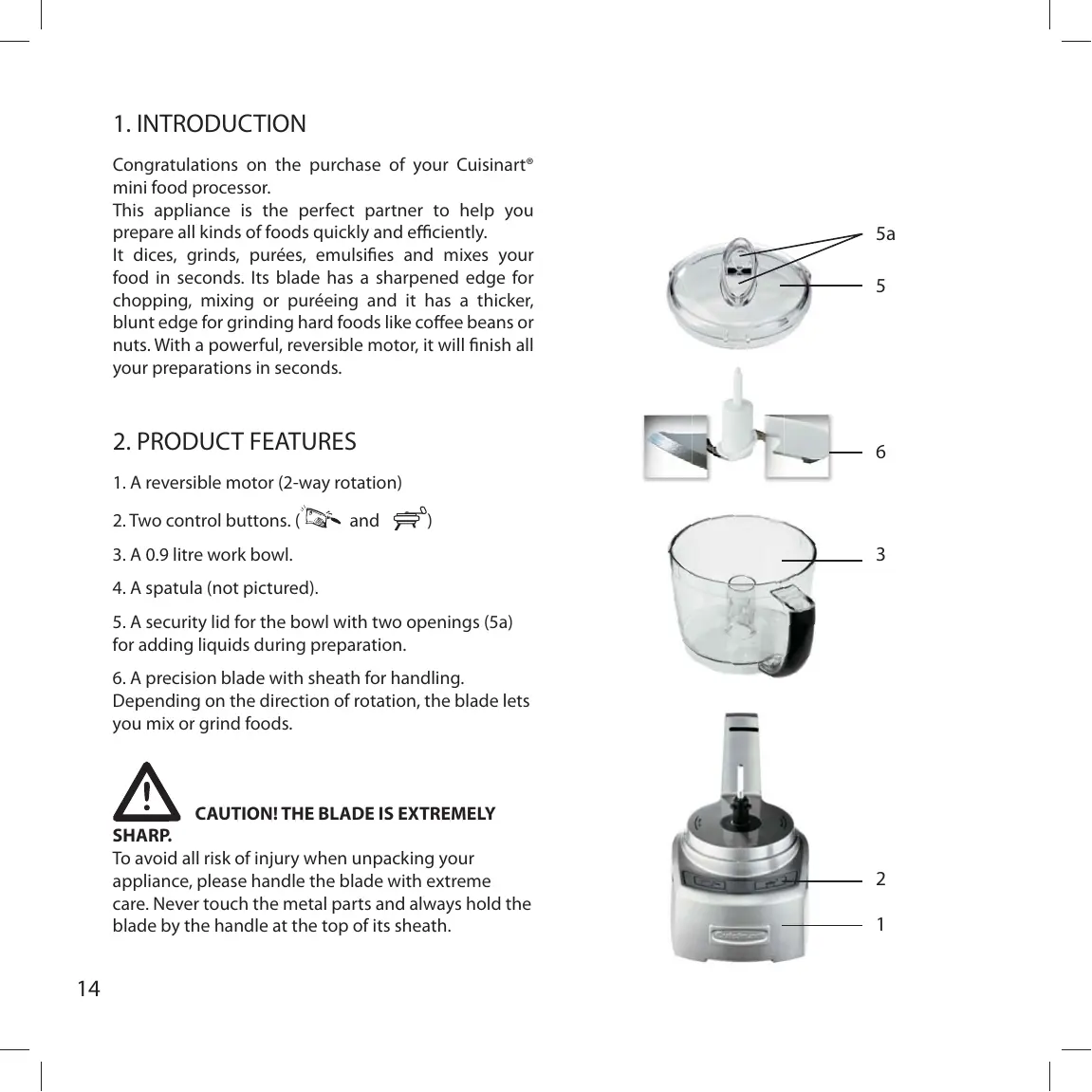 Congratulations on the purchase of your Cuisinart® mini food processor. This appliance is the perfect partner to help you prepare all kinds of foods quickly and efficiently. It dices, grinds, purées, emulsifies and mixes your food in seconds. Its blade has a sharpened edge for chopping, mixing or puréeing and it has a thicker, blunt edge for grinding hard foods like coffee beans or nuts. With a powerful, reversible motor, it will finish all your preparations in seconds.