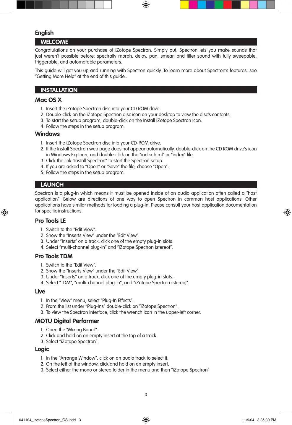 64-bit Spectral Domain Effects Processing Quick Start Guide This guide is intended to help get you started quickly. In order to achieve optimal usage of your new iZotope Spectron™, we recommend that you carefully study the enclosed product manual, either after completing the process described in this guide or before. 041104_IzotopeSpectron_QS.indd 1 11/9/04 3:35:30 PM English WELCOME Congratulations on your purchase of iZotope Spectron. Simply put, Spectron lets you make sounds that just weren’t possible before: spectrally morph, delay, pan, smear, and filter sound with fully sweepable, triggerable, and automatable parameters. This guide will get you up and running with Spectron quickly. To learn more about Spectron’s features, see “Getting More Help” at the end of this guide.. Insert the iZotope Spectron disc into your CD ROM drive. Double-click on the iZotope Spectron disc icon on your desktop to view the disc’s contents. To start the setup program, double-click on the Install iZotope Spectron icon. Follow the steps in the setup program. Windows