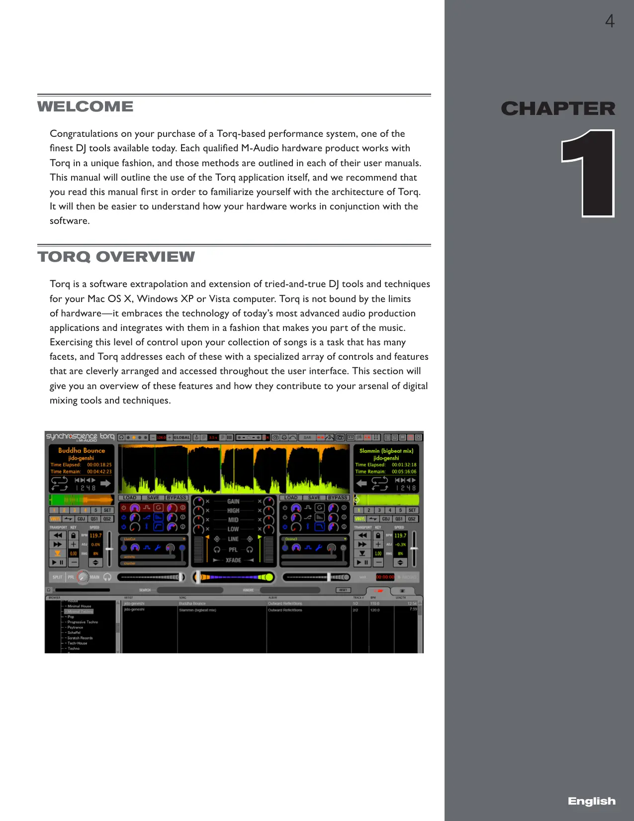 WELCOME Congratulations on your purchase of a Torq-based performance system, one of the finest DJ tools available today. Each qualified M-Audio hardware product works with Torq in a unique fashion, and those methods are outlined in each of their user manuals. This manual will outline the use of the Torq application itself, and we recommend that you read this manual first in order to familiarize yourself with the architecture of Torq. It will then be easier to understand how your hardware works in conjunction with the software. CHAPTER