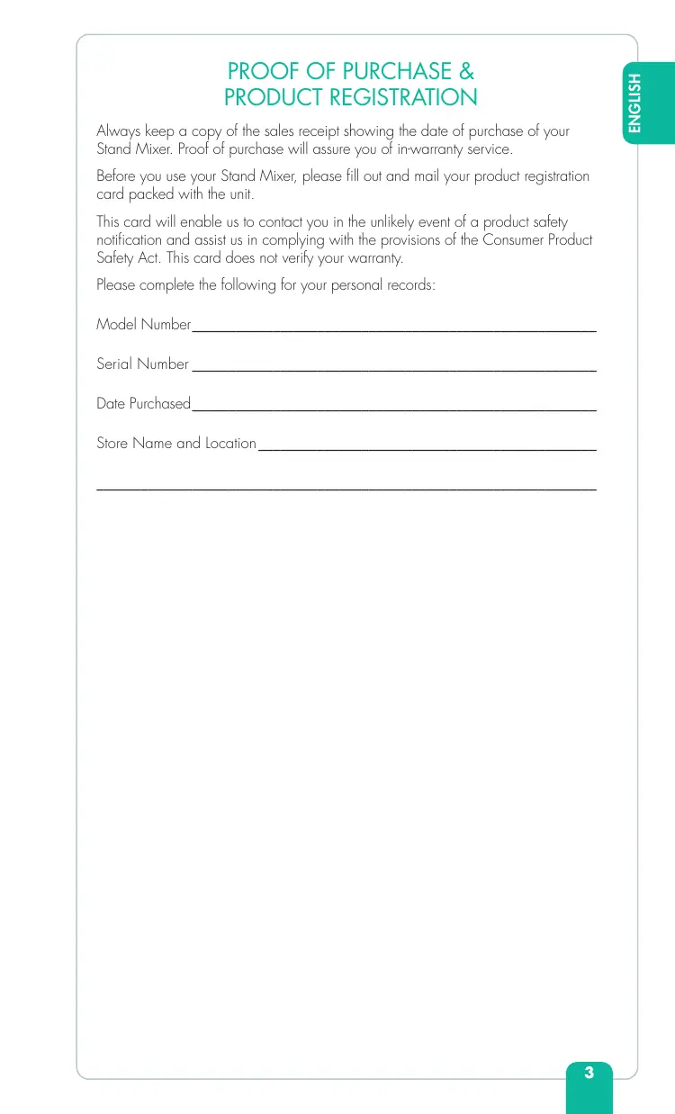 PRODUCT REGISTRATION Always keep a copy of the sales receipt showing the date of purchase of your Stand Mixer. Proof of purchase will assure you of in-warranty service. Before you use your Stand Mixer, please fill out and mail your product registration card packed with the unit. This card will enable us to contact you in the unlikely event of a product safety notification and assist us in complying with the provisions of the Consumer Product Safety Act. This card does not verify your warranty. Please complete the following for your personal records: Model Number _______________________________________________________ Serial Number _______________________________________________________ Date Purchased _______________________________________________________ Store Name and Location ______________________________________________ ____________________________________________________________________