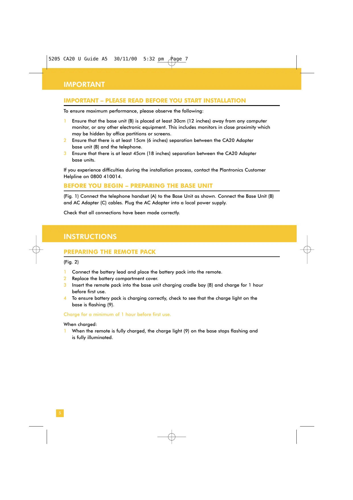 Ensure that the base unit (B) is placed at least 30cm (12 inches) away from any computer monitor, or any other electronic equipment. This includes monitors in close proximity which may be hidden by office partitions or screens. Ensure that there is at least 15cm (6 inches) separation between the CA20 Adapter base unit (B) and the telephone. Ensure that there is at least 45cm (18 inches) separation between the CA20 Adapter base units. If you experience difficulties during the installation process, contact the Plantronics Customer Helpline on 0800 410014. BEFORE YOU BEGIN – PREPARING THE BASE UNIT (Fig. 1) Connect the telephone handset (A) to the Base Unit as shown. Connect the Base Unit (B) and AC Adapter (C) cables. Plug the AC Adapter into a local power supply. Check that all connections have been made correctly. INSTRUCTIONS