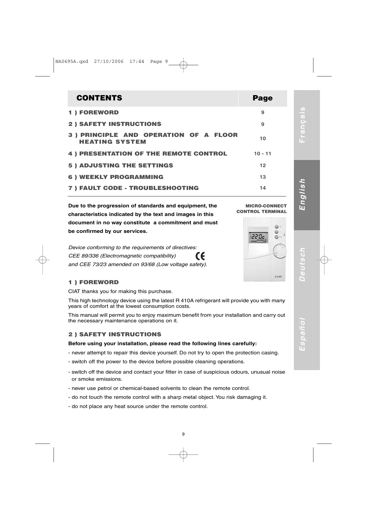 Español This high technology device using the latest R 410A refrigerant will provide you with many years of comfort at the lowest consumption costs. NA0695A.qxd 27/10/2006 17:44 Page 10 Français 3 ) PRINCIPLE AND OPERATION OF A FLOOR HEATING SYSTEM To use a floor heating system, you must be aware of the following key points: A floor heating system is an excellent means of heating since it uses low temperature radiation to heat the atmosphere evenly without any interfering air movement. Floor heating does not need to be very hot to be efficient. In fact it must never be very hot. At most it should be quite warm during cold weather. Given the effect of radiation, thermal comfort is generally obtained with lower air temperatures than with traditional heating methods (convection). English Another advantage of floor heating is that it has very stable regulation, thereby avoiding sudden changes of temperature. However, this great stability implies that reaction time is in the region of several hours. This means that with floor heating, warming up is always gradual and that temperature variations must be as low as possible. Taking into account the above, CIAT has opted for regulation based on response as a function of external temperature. The temperature of the floor therefore depends on the temperature outdoors. The specialists speak of regulation by water balance. The regulation of this water balance must be left to your fitter who will adjust it as a function of your dwelling and wishes. Español