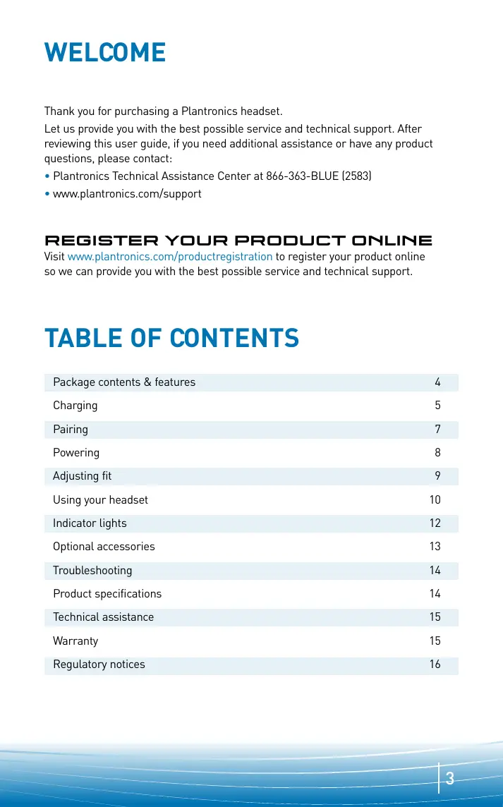 WELCOME Thank you for purchasing a Plantronics headset. Let us provide you with the best possible service and technical support. After reviewing this user guide, if you need additional assistance or have any product questions, please contact: