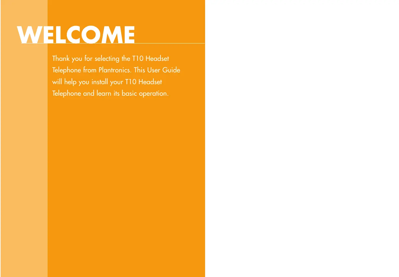 WELCOME Thank you for selecting the T10 Headset Telephone from Plantronics. This User Guide will help you install your T10 Headset Telephone and learn its basic operation.