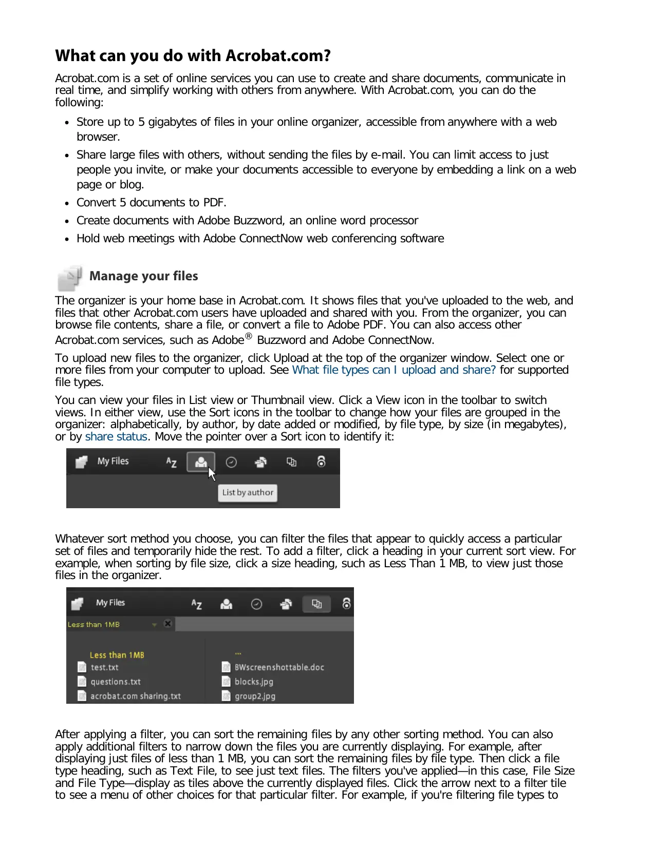 You may be in the Buzzword organizer. Your Acrobat.com files are stored in the Acrobat.com organizer. The Acrobat.com organizer may include files you uploaded from your computer, files that were shared with you, or PDFs you created. From Acrobat.com you can switch to Buzzword, which has its own Document Organizer. The Buzzword Document Organizer contains only Buzzword documents (your own and documents shared with you by other collaborators).
