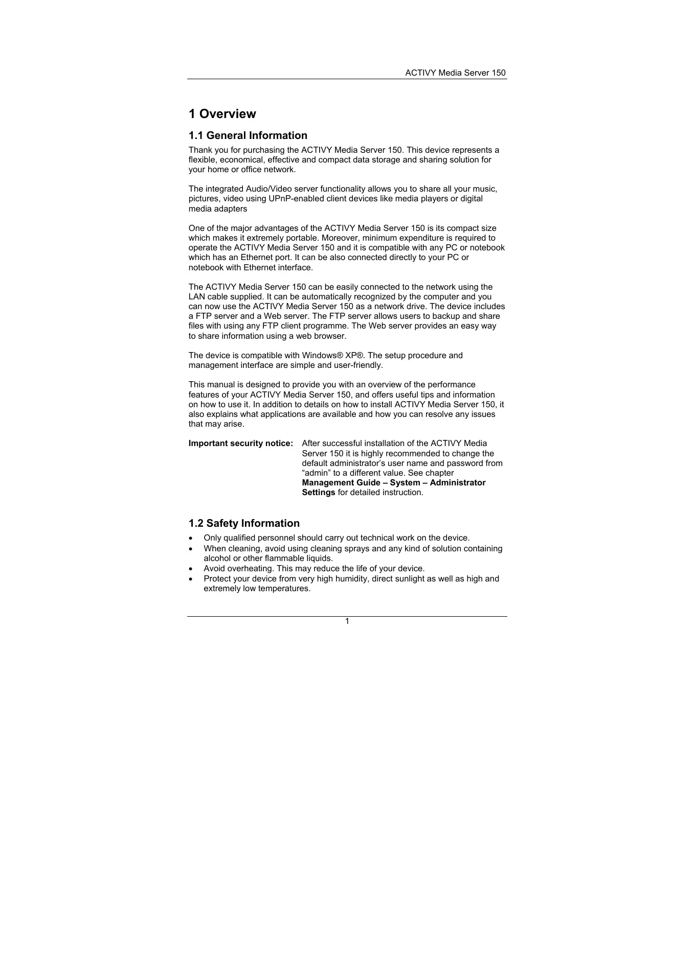 Thank you for purchasing the ACTIVY Media Server 150. This device represents a flexible, economical, effective and compact data storage and sharing solution for your home or office network. The integrated Audio/Video server functionality allows you to share all your music, pictures, video using UPnP-enabled client devices like media players or digital media adapters One of the major advantages of the ACTIVY Media Server 150 is its compact size which makes it extremely portable. Moreover, minimum expenditure is required to operate the ACTIVY Media Server 150 and it is compatible with any PC or notebook which has an Ethernet port. It can be also connected directly to your PC or notebook with Ethernet interface. The ACTIVY Media Server 150 can be easily connected to the network using the LAN cable supplied. It can be automatically recognized by the computer and you can now use the ACTIVY Media Server 150 as a network drive. The device includes a FTP server and a Web server. The FTP server allows users to backup and share files with using any FTP client programme. The Web server provides an easy way to share information using a web browser. The device is compatible with Windows® XP®. The setup procedure and management interface are simple and user-friendly. This manual is designed to provide you with an overview of the performance features of your ACTIVY Media Server 150, and offers useful tips and information on how to use it. In addition to details on how to install ACTIVY Media Server 150, it also explains what applications are available and how you can resolve any issues that may arise. Important security notice: After successful installation of the ACTIVY Media Server 150 it is highly recommended to change the default administrator’s user name and password from “admin” to a different value. See chapter Management Guide – System – Administrator Settings for detailed instruction.