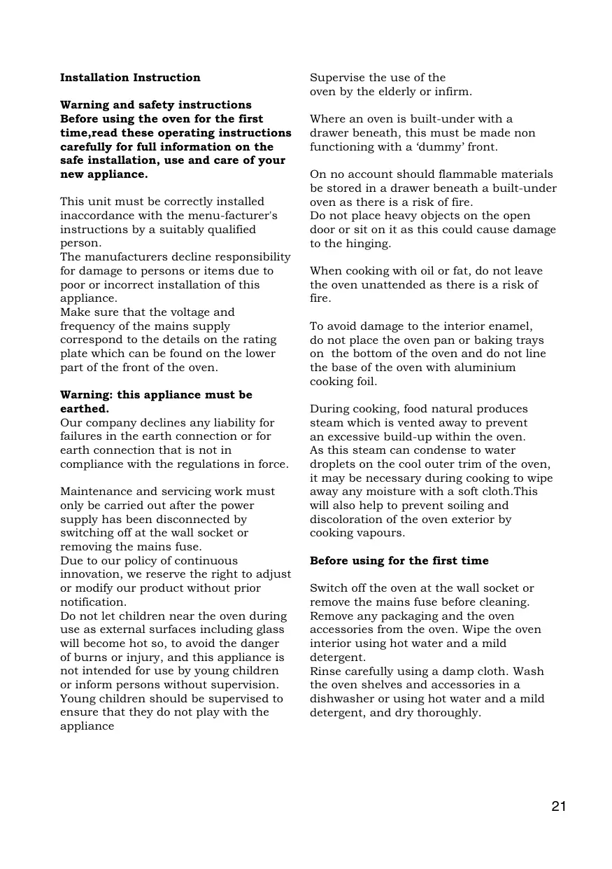 earthed. Our company declines any liability for failures in the earth connection or for earth connection that is not in compliance with the regulations in force. Maintenance and servicing work must only be carried out after the power supply has been disconnected by switching off at the wall socket or removing the mains fuse. Due to our policy of continuous innovation, we reserve the right to adjust or modify our product without prior notification. Do not let children near the oven during use as external surfaces including glass will become hot so, to avoid the danger of burns or injury, and this appliance is not intended for use by young children or inform persons without supervision. Young children should be supervised to ensure that they do not play with the appliance Supervise the use of the oven by the elderly or infirm. Where an oven is built-under with a drawer beneath, this must be made non functioning with a ‘dummy’ front. On no account should flammable materials be stored in a drawer beneath a built-under oven as there is a risk of fire. Do not place heavy objects on the open door or sit on it as this could cause damage to the hinging. When cooking with oil or fat, do not leave the oven unattended as there is a risk of fire. To avoid damage to the interior enamel, do not place the oven pan or baking trays on the bottom of the oven and do not line the base of the oven with aluminium cooking foil. During cooking, food natural produces steam which is vented away to prevent an excessive build-up within the oven. As this steam can condense to water droplets on the cool outer trim of the oven, it may be necessary during cooking to wipe away any moisture with a soft cloth.This will also help to prevent soiling and discoloration of the oven exterior by cooking vapours. Before using for the first time Switch off the oven at the wall socket or remove the mains fuse before cleaning. Remove any packaging and the oven accessories from the oven. Wipe the oven interior using hot water and a mild detergent. Rinse carefully using a damp cloth. Wash the oven shelves and accessories in a dishwasher or using hot water and a mild detergent, and dry thoroughly.