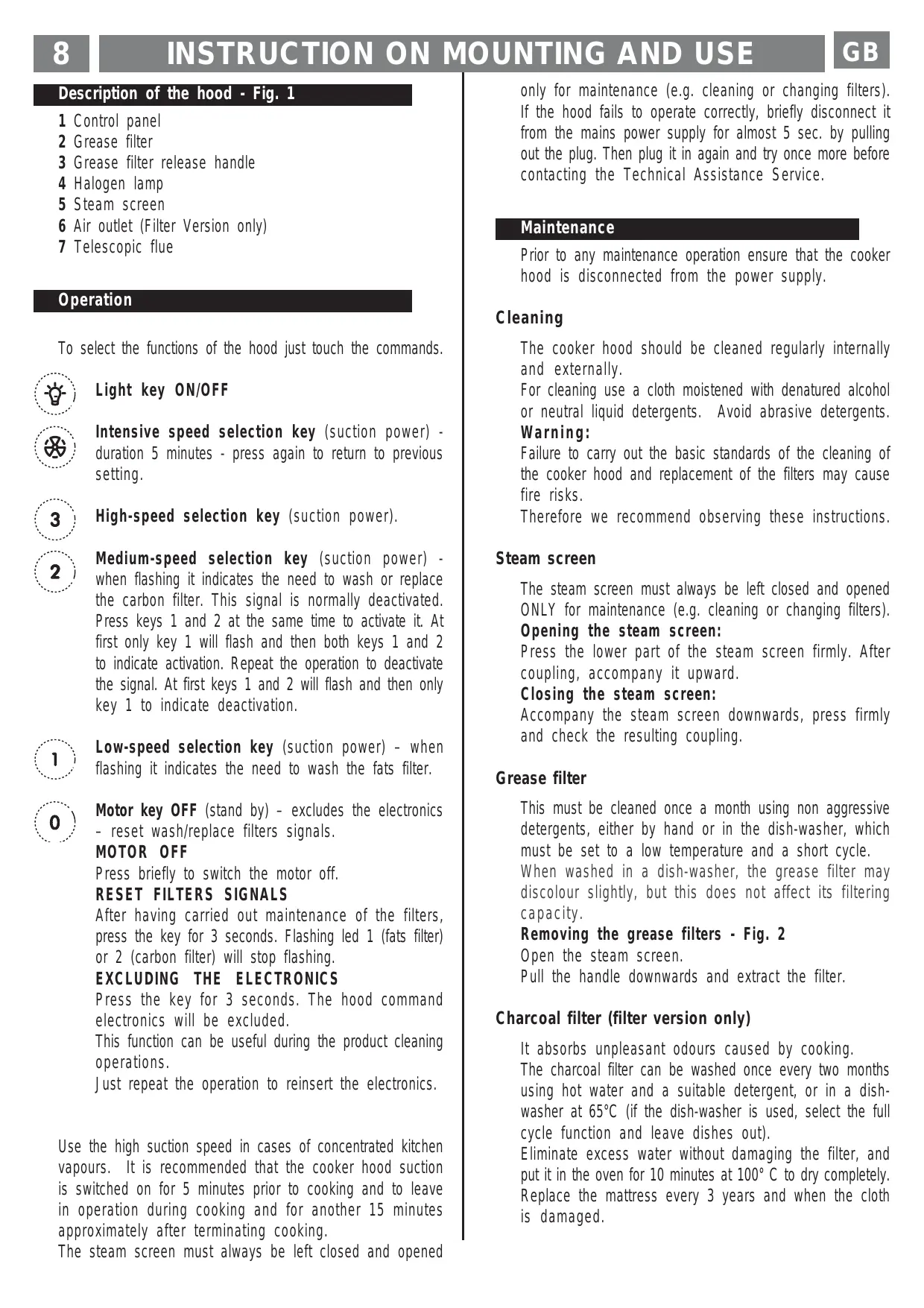 Cleaning To select the functions of the hood just touch the commands. Light key ON/OFF Intensive speed selection key (suction power) duration 5 minutes - press again to return to previous setting. High-speed selection key (suction power). Medium-speed selection key (suction power) when flashing it indicates the need to wash or replace the carbon filter. This signal is normally deactivated. Press keys 1 and 2 at the same time to activate it. At first only key 1 will flash and then both keys 1 and 2 to indicate activation. Repeat the operation to deactivate the signal. At first keys 1 and 2 will flash and then only key 1 to indicate deactivation. Low-speed selection key (suction power) – when flashing it indicates the need to wash the fats filter. Motor key OFF (stand by) – excludes the electronics – reset wash/replace filters signals. MOTOR OFF Press briefly to switch the motor off. RESET FILTERS SIGNALS After having carried out maintenance of the filters, press the key for 3 seconds. Flashing led 1 (fats filter) or 2 (carbon filter) will stop flashing. EXCLUDING THE ELECTRONICS Press the key for 3 seconds. The hood command electronics will be excluded. This function can be useful during the product cleaning operations. Just repeat the operation to reinsert the electronics.