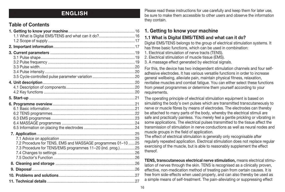 For this, the device has two independent stimulation channels and four selfadhesive electrodes. It has various versatile functions in order to increase general wellbeing, alleviate pain, maintain physical fitness, relaxation, revitalise muscles and combat fatigue. You can either select these functions from preset programmes or determine them yourself according to your requirements. The operating principle of electrical stimulation equipment is based on simulating the body’s own pulses which are transmitted transcutaneously to nerve or muscle fibres by means of electrodes. The electrodes can thereby be attached to many parts of the body, whereby the electrical stimuli are safe and practically painless. You merely feel a gentle prickling or vibrating in some applications. The electrical pulses transmitted to the tissue affect the transmission of stimulation in nerve conductions as well as neural nodes and muscle groups in the field of application. The effect of electrical stimulation is generally only recognisable after regularly repeated application. Electrical stimulation does not replace regular exercising of the muscle, but is able to reasonably supplement the effect thereof. TENS, transcutaneous electrical nerve stimulation, means electrical stimu lation of nerves through the skin. TENS is recognised as a clinically proven, effective, non-medication method of treating pain from certain causes. It is free from side-effects when used properly, and can also thereby be used as a simple means of self-treatment. The pain-alleviating or suppressing effect