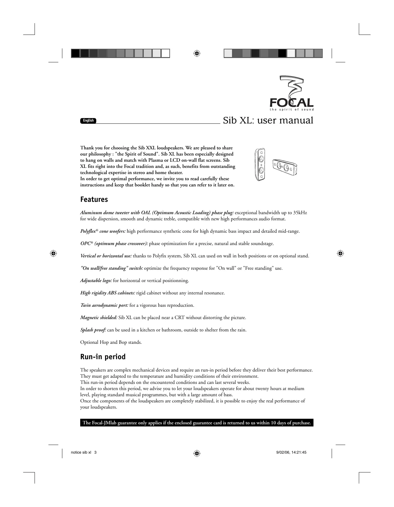 Sib User manual Installation guide page: 3 Guide d’installation page : 7 Sib®, Sib XL®, Sib XXL® & Cub 2® are trademarks of Focal-JMlab® B P 3 7 4 - 1 0 8 , r u e d e l ' Av e n i r - 4 2 3 5 3 L a Ta l a u d i è r e c e d e x - Fr a n c e - w w w. f o c a l - f r. c o m Te l . 0 0 3 3 4 7 7 4 3 5 7 0 0 - F a x 0 0 3 3 4 7 7 4 3 5 7 0 4 Due to constant technological advances, Focal-JMlab reserves its right to modify specifications without notice. Images may not conform exactly to specific product. notice sib xl 1 9/02/06, 14:21:44 notice sib xl 2 9/02/06, 14:21:45 English Sib XL: user manual Thank you for choosing the Sib XXL loudspeakers. We are pleased to share our philosophy : "the Spirit of Sound". Sib XL has been especially designed to hang on walls and match with Plasma or LCD on-wall flat screens. Sib XL fits right into the Focal tradition and, as such, benefits from outstanding technological expertise in stereo and home theater. In order to get optimal performance, we invite you to read carefully these instructions and keep that booklet handy so that you can refer to it later on. Features Aluminum dome tweeter with OAL (Optimum Acoustic Loading) phase plug: exceptional bandwidth up to 35kHz for wide dispersion, smooth and dynamic treble, compatible with new high performances audio format. Polyflex® cone woofers: high performance synthetic cone for high dynamic bass impact and detailed mid-range. OPC® (optimum phase crossover): phase optimization for a precise, natural and stable soundstage. Vertical or horizontal use: thanks to Polyfix system, Sib XL can used on wall in both positions or on optional stand. "On wall/free standing" switch: optimize the frequency response for "On wall" or "Free standing" use. Adjustable logo: for horizontal or vertical positionning. High rigidity ABS cabinets: rigid cabinet without any internal resonance. Twin aerodynamic port: for a vigorous bass reproduction. Magnetic shielded: Sib XL can be placed near a CRT without distorting the picture. Splash proof: can be used in a kitchen or bathroom, outside to shelter from the rain. Optional Hop and Bop stands. Run-in period The speakers are complex mechanical devices and require an run-in period before they deliver their best performance. They must get adapted to the temperature and humidity conditions of their environment. This run-in period depends on the encountered conditions and can last several weeks. In order to shorten this period, we advise you to let your loudspeakers operate for about twenty hours at medium level, playing standard musical programmes, but with a large amount of bass. Once the components of the loudspeakers are completely stabilized, it is possible to enjoy the real performance of your loudspeakers. The Focal-JMlab guarantee only applies if the enclosed guarantee card is returned to us within 10 days of purchase. notice sib xl 3 9/02/06, 14:21:45