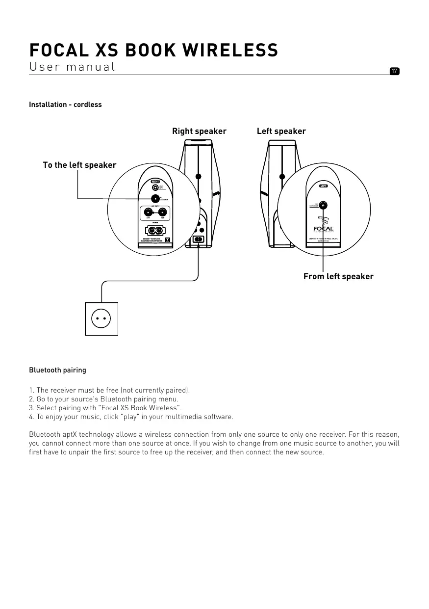 Download the instructions for your Wireless Speaker in PDF format for free! Find your manual XS BOOK WIRELESS - FOCAL and take your electronic device back in hand. On this page are published all the documents necessary for the use of your device. XS BOOK WIRELESS by FOCAL.