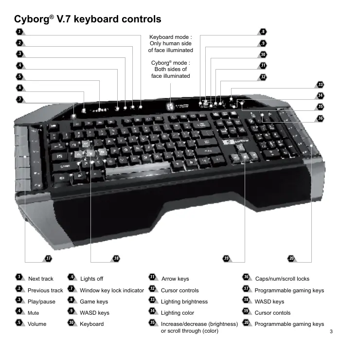 This is indicated by the left half of the Cyborg® head icon illuminated. The media keys, brightness and colour controls, and keyboard lights on/off icon are also illuminated dimly. When in normal mode only the colour and the brightness of the keyboard can be changed and game keys are not lit. Cyborg® Mode This is indicated by the whole Cyborg® head icon illuminated. Everything that is lit in Normal mode plus the Widows key lock indicator and icons to select lighting for the individual key areas (Game keys, WASD, QWERTY, Arrow keys, Num-pad) are also lit. The Num pad, Game keys, WASD keys and Arrow keys all have independent controlled coloured lighting in Cyborg® mode. The Cyborg® keyboard also includes 12 gaming keys which are programmable using Cyborg® Smart Technology software and media keys for controlling music or video tracks. The WASD, cursor, Cyborg® and NumPad keys can be lit independently from the rest of keyboard to highlight commonly used gaming keys.