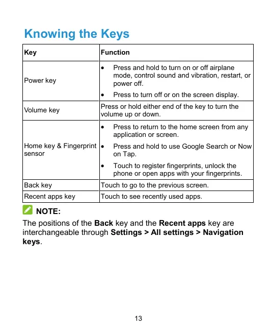 NOTE: The positions of the Back key and the Recent apps key are interchangeable through Settings > All settings > Navigation keys.