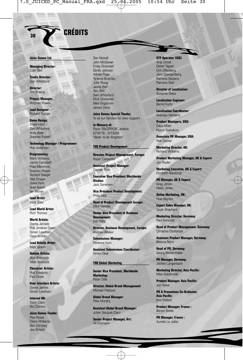 Dan Nuttall John McGowan Craig Grounsell Derek Johnson Adrian Page Tyronne Bramley Julia Young Jackie Bell Tom Bell Sam Whiteford Elliot Ormesher Mike Engstrom James Dima Juice Games Special Thanks: To all our families for their support In Memory of: Paulo 'RACERX2K' Jenkins 6/18/78 - 5/15/04 'Never to be forgotten' THQ Product Development Director, Project Management, Europe: Roger Carpenter Assistant Project Manager: Damian Finn Executive Vice President Worldwide Studios: Jack Sorensen Vice President Product Development: Philip Holt Head of Product Development Europe: Mike Gamble DTP Operator (ICD) Anja Untiet Detlef Tapper Dirk Offenberg Jens Spangenberg Ramona Sackers Ramona Stell Director of Localization: Susanne Dieck Localization Engineer: Bernd Kurtz Localization Coordinator: Andreas Herbertz Product Managers, USA: Dave Miller Rocco Scandizzo Associate PR Manager, USA: Rob Cassel Marketing Director, UK: Richard Williams Product Marketing Manager, UK & Export: Jon Rooke Marketing Executive, UK & Export: Elizabeth Blackman PR Manager, UK & Export: Greg Jones Helen Jones Online Marketing, UK: Huw Beynon Export Sales Manager, UK: Gayle Shepherd Senior Vice President of Business Development: Dan Kelly Marketing Director, Germany: Paul Ashcroft Director, Business Development, Europe: Andrew Walker Head of Product Management, Germany: Christina Ettelbrück Submissions Manager: Florence Kum Assistant Product Manager, Germany: Bettina Nonn Assistant Submissions Coordinator: Simon Deal Head of PR, Germany: Georg Reckenthäler THQ Global Marketing PR Manager, Germany: Jochen Langenbach Senior Vice President, Worldwide Marketing: Peter Dille Director, Global Brand Management: Michael Pattison Marketing Director, Asia Pacific: Mike Kolodzinski Product Manager, Asia Pacific: Jon Rowe Global Brand Manager: Pete Murphy PR & Promotions Co-Ordinator, Asia Pacific: Ben Pollock Assistant Global Brand Manager: Julien Socquet-Clerc Product Manager, France : Benoit Bohet Senior Project Manager, Art: Till Enzmann PR Manager, France : Aurelie Le Jollec 7.0_JUICED_PC_Manual_FRA.qxd