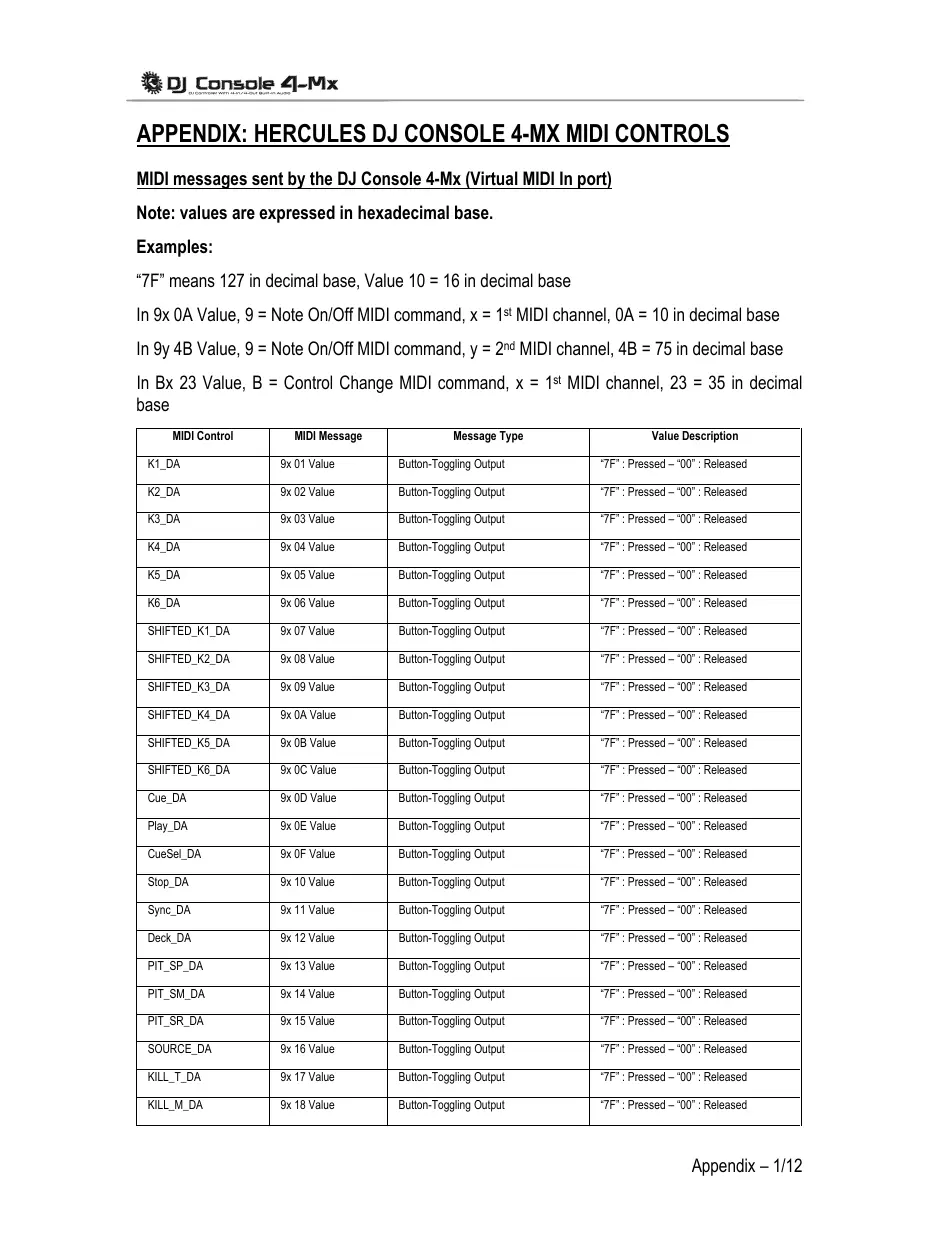 APPENDIX: HERCULES DJ CONSOLE 4-MX MIDI CONTROLS MIDI messages sent by the DJ Console 4-Mx (Virtual MIDI In port) Note: values are expressed in hexadecimal base. Examples: “7F” means 127 in decimal base, Value 10 = 16 in decimal base In 9x 0A Value, 9 = Note On/Off MIDI command, x = 1st MIDI channel, 0A = 10 in decimal base In 9y 4B Value, 9 = Note On/Off MIDI command, y = 2nd MIDI channel, 4B = 75 in decimal base In Bx 23 Value, B = Control Change MIDI command, x = 1st MIDI channel, 23 = 35 in decimal base MIDI Control