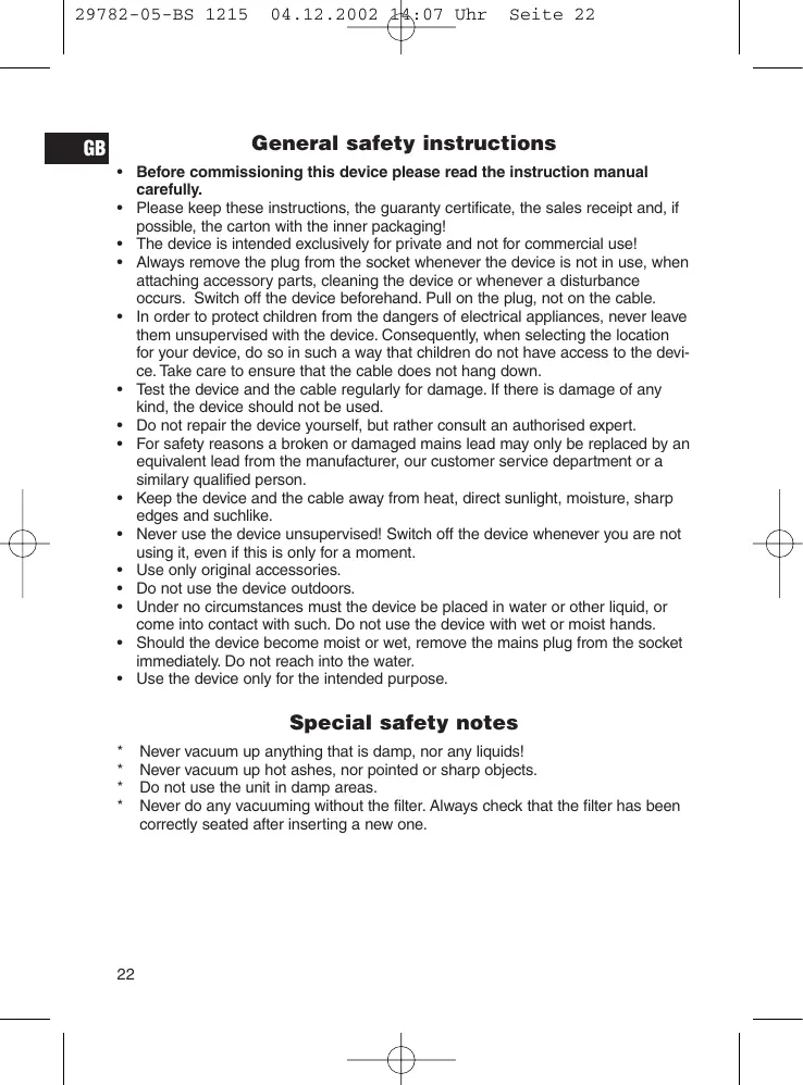 • Please keep these instructions, the guaranty certificate, the sales receipt and, if possible, the carton with the inner packaging! • The device is intended exclusively for private and not for commercial use! • Always remove the plug from the socket whenever the device is not in use, when attaching accessory parts, cleaning the device or whenever a disturbance occurs. Switch off the device beforehand. Pull on the plug, not on the cable. • In order to protect children from the dangers of electrical appliances, never leave them unsupervised with the device. Consequently, when selecting the location for your device, do so in such a way that children do not have access to the device. Take care to ensure that the cable does not hang down. • Test the device and the cable regularly for damage. If there is damage of any kind, the device should not be used. • Do not repair the device yourself, but rather consult an authorised expert. • For safety reasons a broken or damaged mains lead may only be replaced by an equivalent lead from the manufacturer, our customer service department or a similary qualified person. • Keep the device and the cable away from heat, direct sunlight, moisture, sharp edges and suchlike. • Never use the device unsupervised! Switch off the device whenever you are not using it, even if this is only for a moment. • Use only original accessories. • Do not use the device outdoors. • Under no circumstances must the device be placed in water or other liquid, or come into contact with such. Do not use the device with wet or moist hands. • Should the device become moist or wet, remove the mains plug from the socket immediately. Do not reach into the water. • Use the device only for the intended purpose.