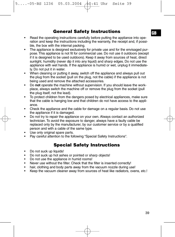 The appliance is designed exclusively for private use and for the envisaged purpose. This appliance is not fit for commercial use. Do not use it outdoors (except if it is designed to be used outdoors). Keep it away from sources of heat, direct sunlight, humidity (never dip it into any liquid) and sharp edges. Do not use the appliance with wet hands. If the appliance is humid or wet, unplug it immediately. Do not put it in water. When cleaning or putting it away, switch off the appliance and always pull out the plug from the socket (pull on the plug, not the cable) if the appliance is not being used and remove the attached accessories. Do not operate the machine without supervision. If you should leave the workplace, always switch the machine off or remove the plug from the socket (pull the plug itself, not the lead). To protect children from the dangers posed by electrical appliances, make sure that the cable is hanging low and that children do not have access to the appliance. Check the appliance and the cable for damage on a regular basis. Do not use the appliance if it is damaged. Do not try to repair the appliance on your own. Always contact an authorized technician. To avoid the exposure to danger, always have a faulty cable be replaced only by the manufacturer, by our customer service or by a qualified person and with a cable of the same type. Use only original spare parts. Pay careful attention to the following “Special Safety Instructions“.