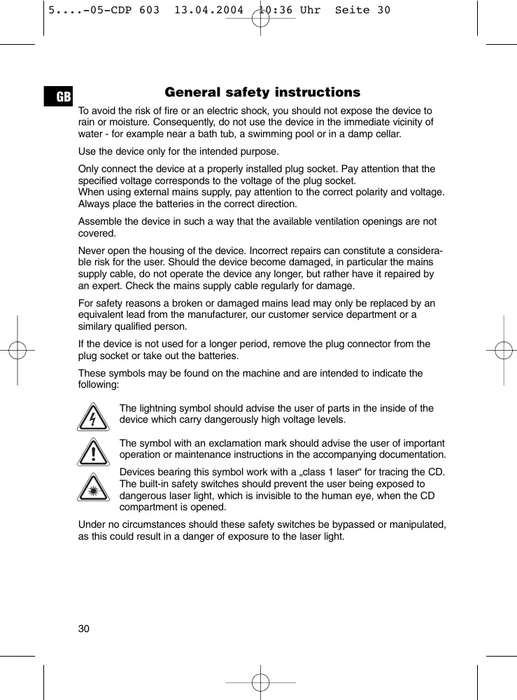 Devices bearing this symbol work with a „class 1 laser“ for tracing the CD. The built-in safety switches should prevent the user being exposed to dangerous laser light, which is invisible to the human eye, when the CD compartment is opened.
