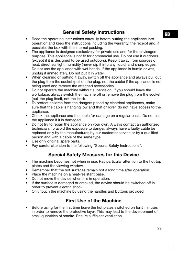Remember that the hot surfaces remain hot a long time after operation. Place the machine on a heat-resistant base. Do not move the device when it is in operation. If the surface is damaged or cracked, the device should be switched off in order to prevent electric shock. Only touch the machine by using the handles and buttons provided.
