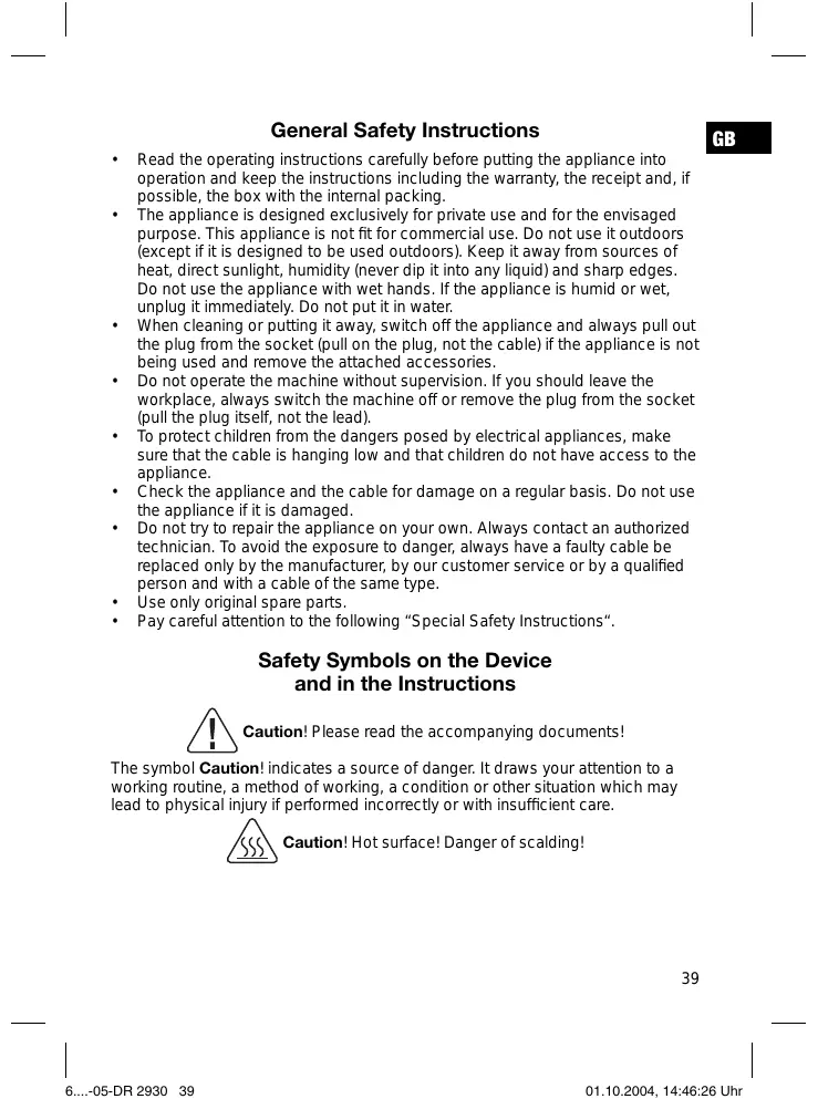 Read the operating instructions carefully before putting the appliance into operation and keep the instructions including the warranty, the receipt and, if possible, the box with the internal packing. The appliance is designed exclusively for private use and for the envisaged purpose. This appliance is not fit for commercial use. Do not use it outdoors (except if it is designed to be used outdoors). Keep it away from sources of heat, direct sunlight, humidity (never dip it into any liquid) and sharp edges. Do not use the appliance with wet hands. If the appliance is humid or wet, unplug it immediately. Do not put it in water. When cleaning or putting it away, switch off the appliance and always pull out the plug from the socket (pull on the plug, not the cable) if the appliance is not being used and remove the attached accessories. Do not operate the machine without supervision. If you should leave the workplace, always switch the machine off or remove the plug from the socket (pull the plug itself, not the lead). To protect children from the dangers posed by electrical appliances, make sure that the cable is hanging low and that children do not have access to the appliance. Check the appliance and the cable for damage on a regular basis. Do not use the appliance if it is damaged. Do not try to repair the appliance on your own. Always contact an authorized technician. To avoid the exposure to danger, always have a faulty cable be replaced only by the manufacturer, by our customer service or by a qualified person and with a cable of the same type. Use only original spare parts. Pay careful attention to the following “Special Safety Instructions“. Safety Symbols on the Device and in the Instructions Caution! Please read the accompanying documents! The symbol Caution! indicates a source of danger. It draws your attention to a working routine, a method of working, a condition or other situation which may lead to physical injury if performed incorrectly or with insufficient care. Caution! Hot surface! Danger of scalding!