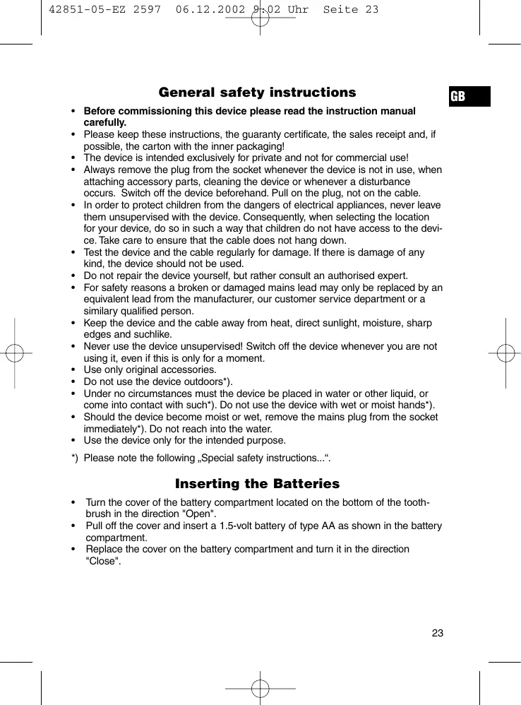• Please keep these instructions, the guaranty certificate, the sales receipt and, if possible, the carton with the inner packaging! • The device is intended exclusively for private and not for commercial use! • Always remove the plug from the socket whenever the device is not in use, when attaching accessory parts, cleaning the device or whenever a disturbance occurs. Switch off the device beforehand. Pull on the plug, not on the cable. • In order to protect children from the dangers of electrical appliances, never leave them unsupervised with the device. Consequently, when selecting the location for your device, do so in such a way that children do not have access to the device. Take care to ensure that the cable does not hang down. • Test the device and the cable regularly for damage. If there is damage of any kind, the device should not be used. • Do not repair the device yourself, but rather consult an authorised expert. • For safety reasons a broken or damaged mains lead may only be replaced by an equivalent lead from the manufacturer, our customer service department or a similary qualified person. • Keep the device and the cable away from heat, direct sunlight, moisture, sharp edges and suchlike. • Never use the device unsupervised! Switch off the device whenever you are not using it, even if this is only for a moment. • Use only original accessories. • Do not use the device outdoors*). • Under no circumstances must the device be placed in water or other liquid, or come into contact with such*). Do not use the device with wet or moist hands*). • Should the device become moist or wet, remove the mains plug from the socket immediately*). Do not reach into the water. • Use the device only for the intended purpose. *) Please note the following „Special safety instructions...“.