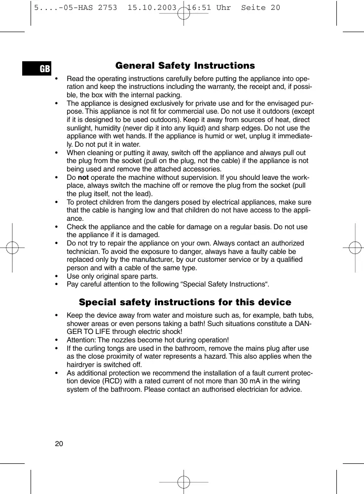 - If the curling tongs are used in the bathroom, remove the mains plug after use as the close proximity of water represents a hazard. This also applies when the hairdryer is switched off.