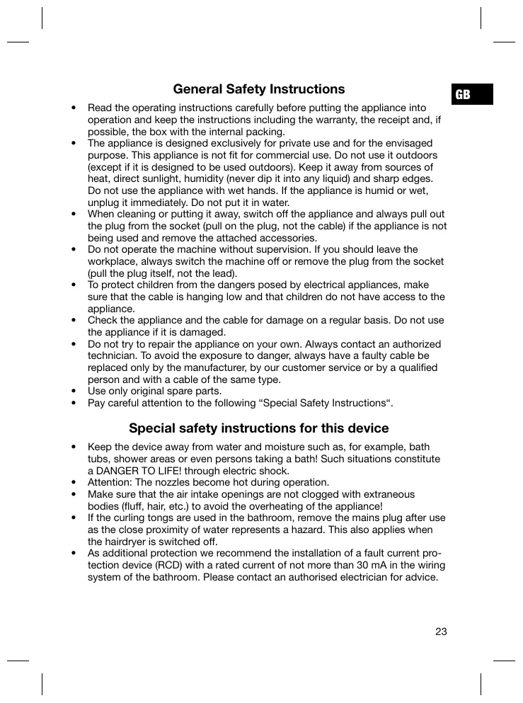 - If the curling tongs are used in the bathroom, remove the mains plug after use as the close proximity of water represents a hazard. This also applies when the hairdryer is switched off.