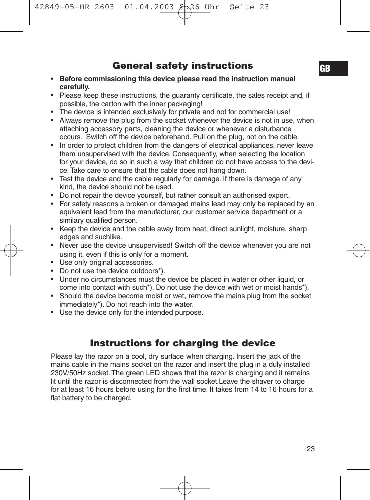 Please lay the razor on a cool, dry surface when charging. Insert the jack of the mains cable in the mains socket on the razor and insert the plug in a duly installed 230V/50Hz socket. The green LED shows that the razor is charging and it remains lit until the razor is disconnected from the wall socket. Leave the shaver to charge for at least 16 hours before using for the first time. It takes from 14 to 16 hours for a flat battery to be charged.