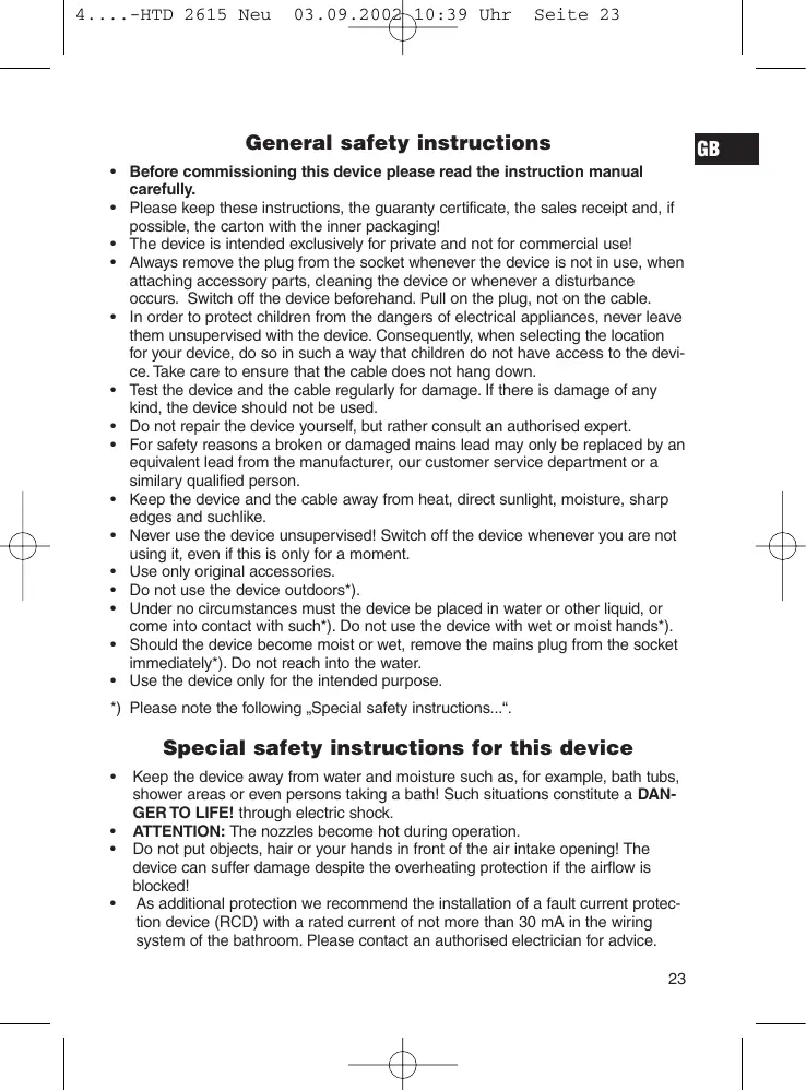 Keep the device away from water and moisture such as, for example, bath tubs, shower areas or even persons taking a bath! Such situations constitute a DANGER TO LIFE! through electric shock. ATTENTION: The nozzles become hot during operation. Do not put objects, hair or your hands in front of the air intake opening! The device can suffer damage despite the overheating protection if the airflow is blocked! As additional protection we recommend the installation of a fault current protection device (RCD) with a rated current of not more than 30 mA in the wiring system of the bathroom. Please contact an authorised electrician for advice.