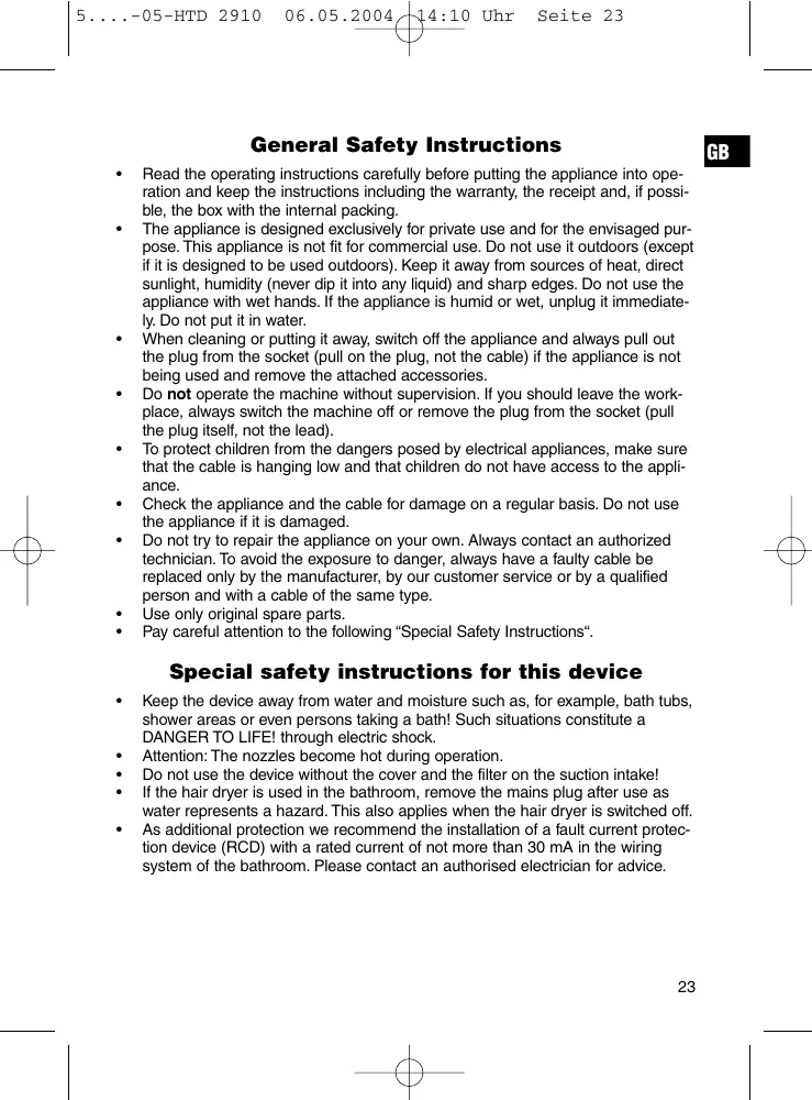 DANGER TO LIFE! through electric shock. Attention: The nozzles become hot during operation. Do not use the device without the cover and the filter on the suction intake! If the hair dryer is used in the bathroom, remove the mains plug after use as water represents a hazard. This also applies when the hair dryer is switched off. As additional protection we recommend the installation of a fault current protection device (RCD) with a rated current of not more than 30 mA in the wiring system of the bathroom. Please contact an authorised electrician for advice.